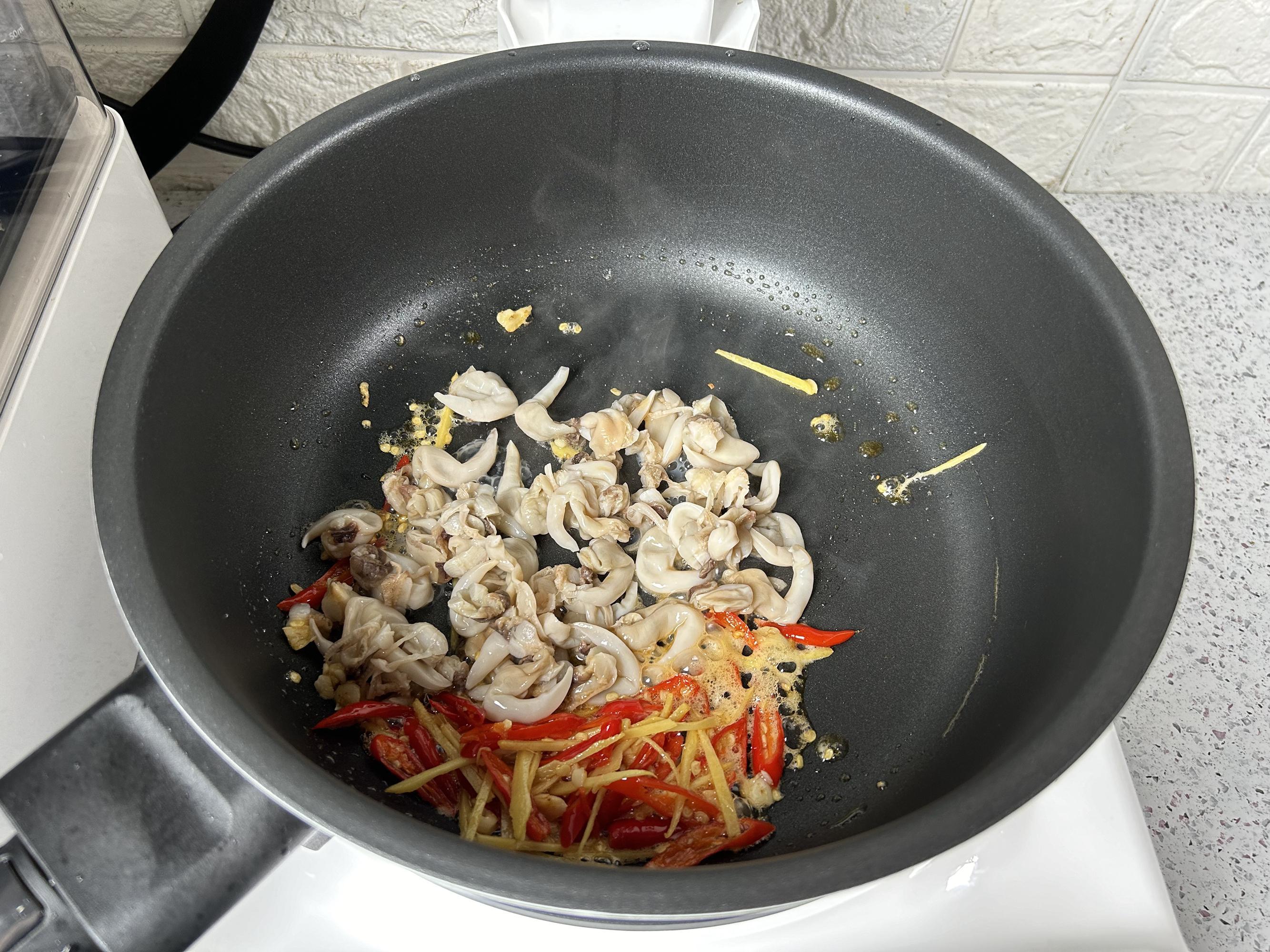 加入鳥貝肉翻炒斷生,加入生抽翻炒到微微上色。