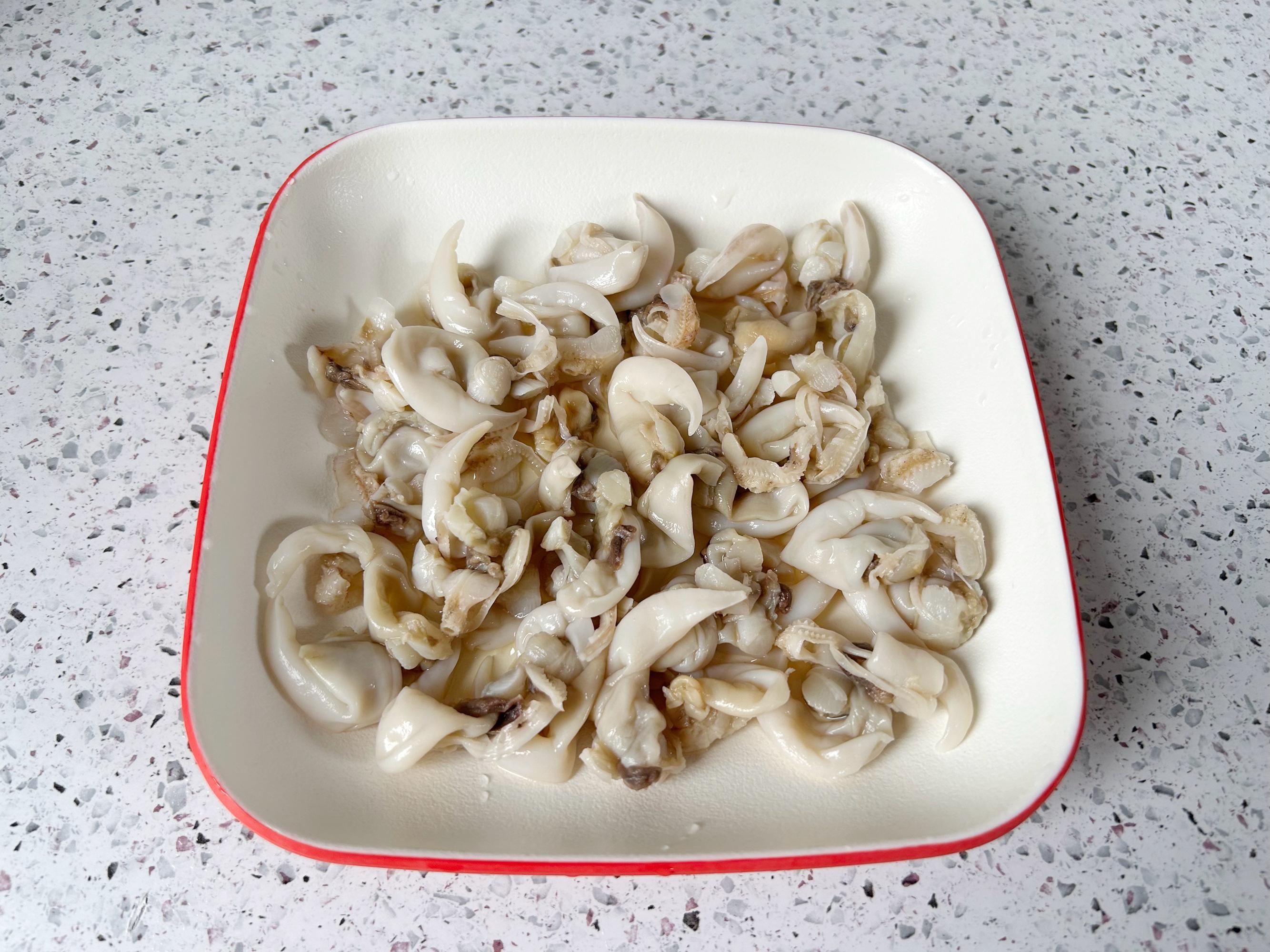於是打電話向做廚師的表哥請教做法,表哥一聽我買了鳥貝肉,當場就笑了,問我爲什麼要買這個食材,說每次有人在飯店點這道菜,都要被後廚罵半個小時。因爲清理鳥貝肉要花不少的時間,要把鳥貝肉一個個剪開,用流動水把裏面的內臟和髒東西全部沖洗乾淨,略有一些費時間。