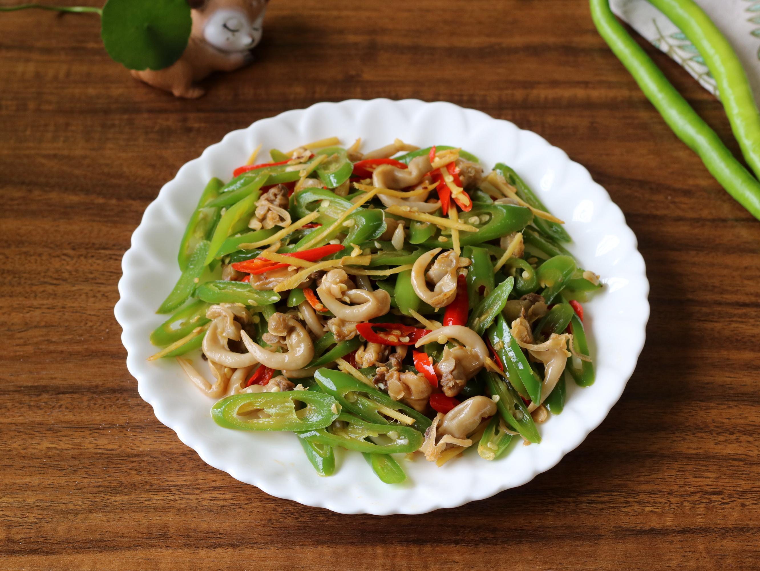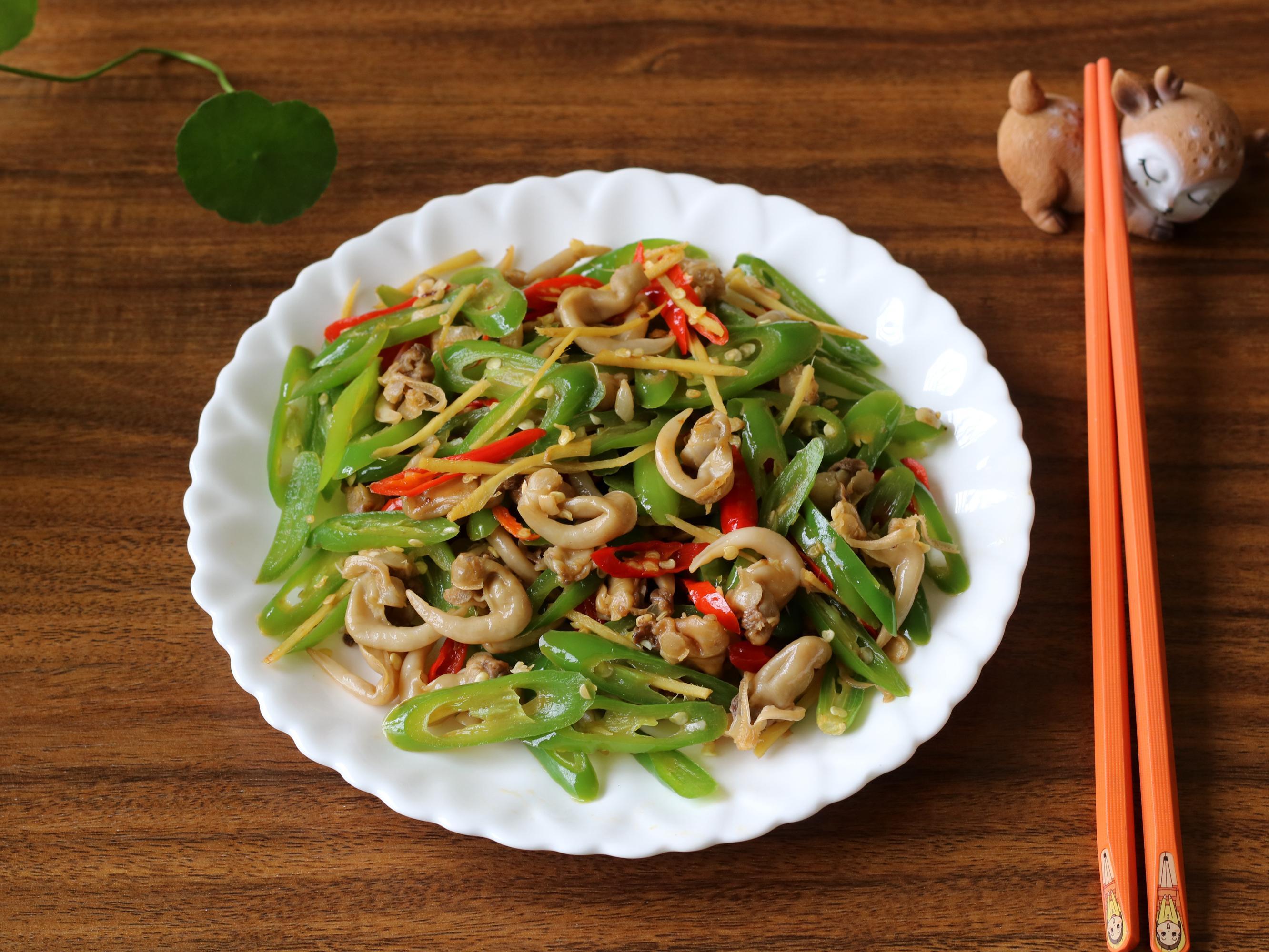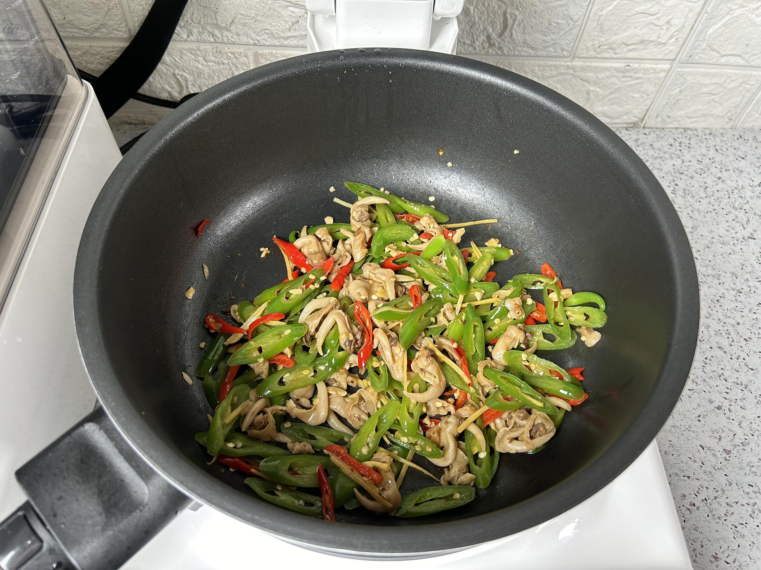 加入青線椒翻炒斷生,加適量的鹽調味,翻炒均勻,一道營養好喫的香辣鳥貝肉就做好了。