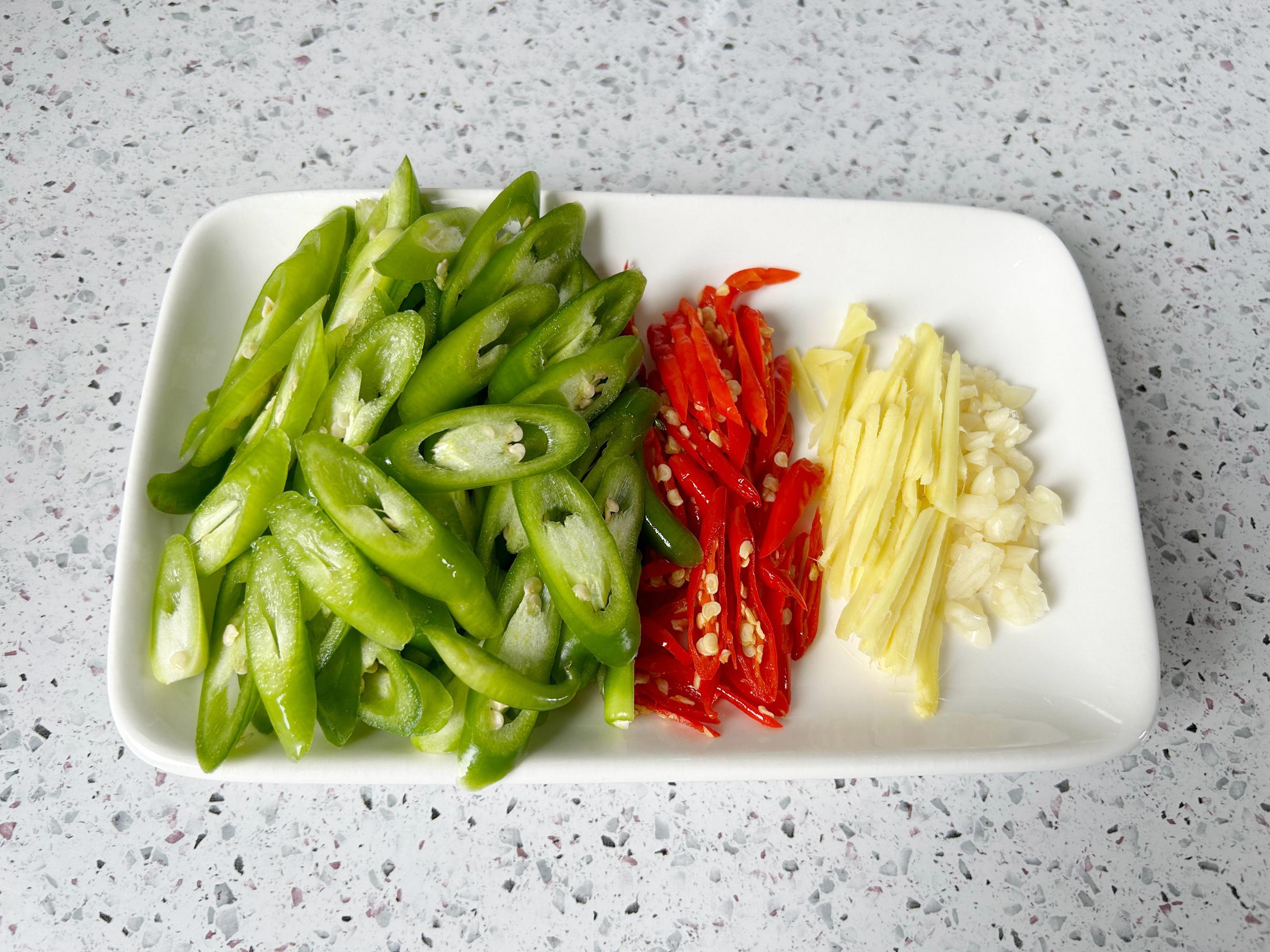 醃鳥貝肉的同時,把大蒜拍扁去皮切顆粒,生薑去皮切絲,泡椒切絲,青線椒斜着切成長段。如果不太能喫辣,可以把青線椒換成肉質厚實的燈籠菜椒。