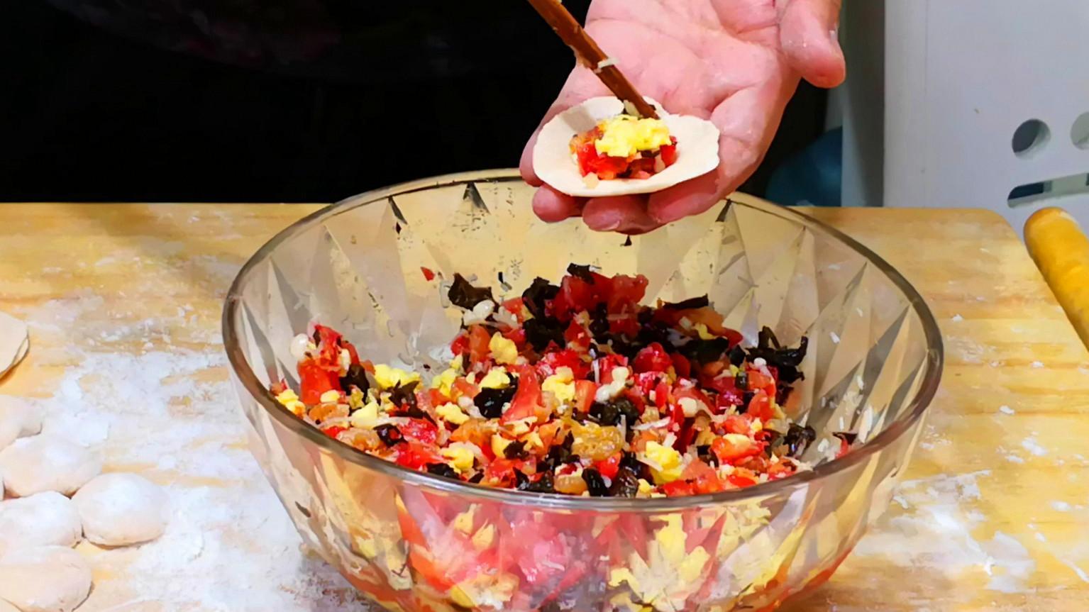 【西紅柿餃子】西紅柿、雞蛋、木耳、幹蝦仁、金針菇等。