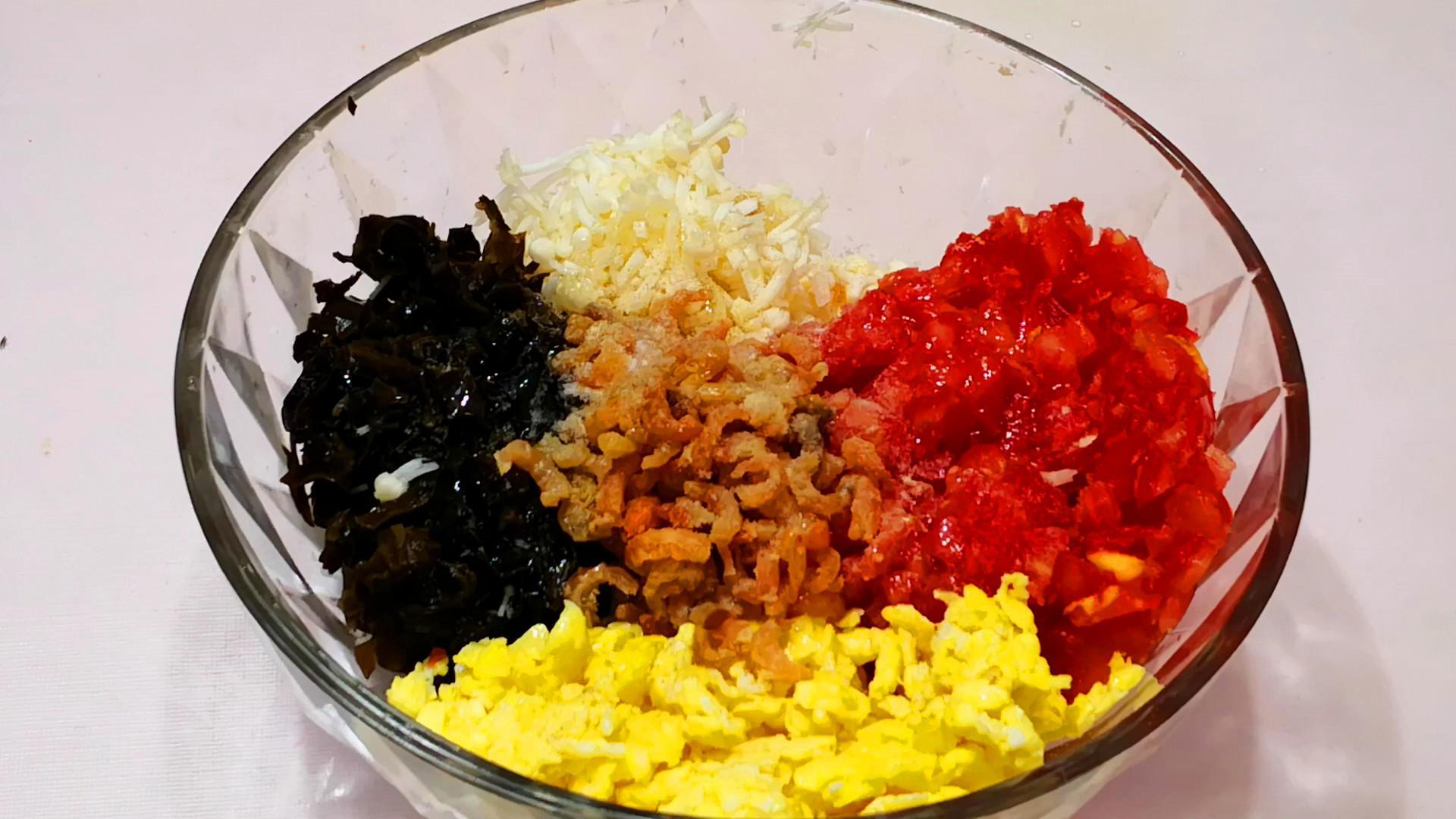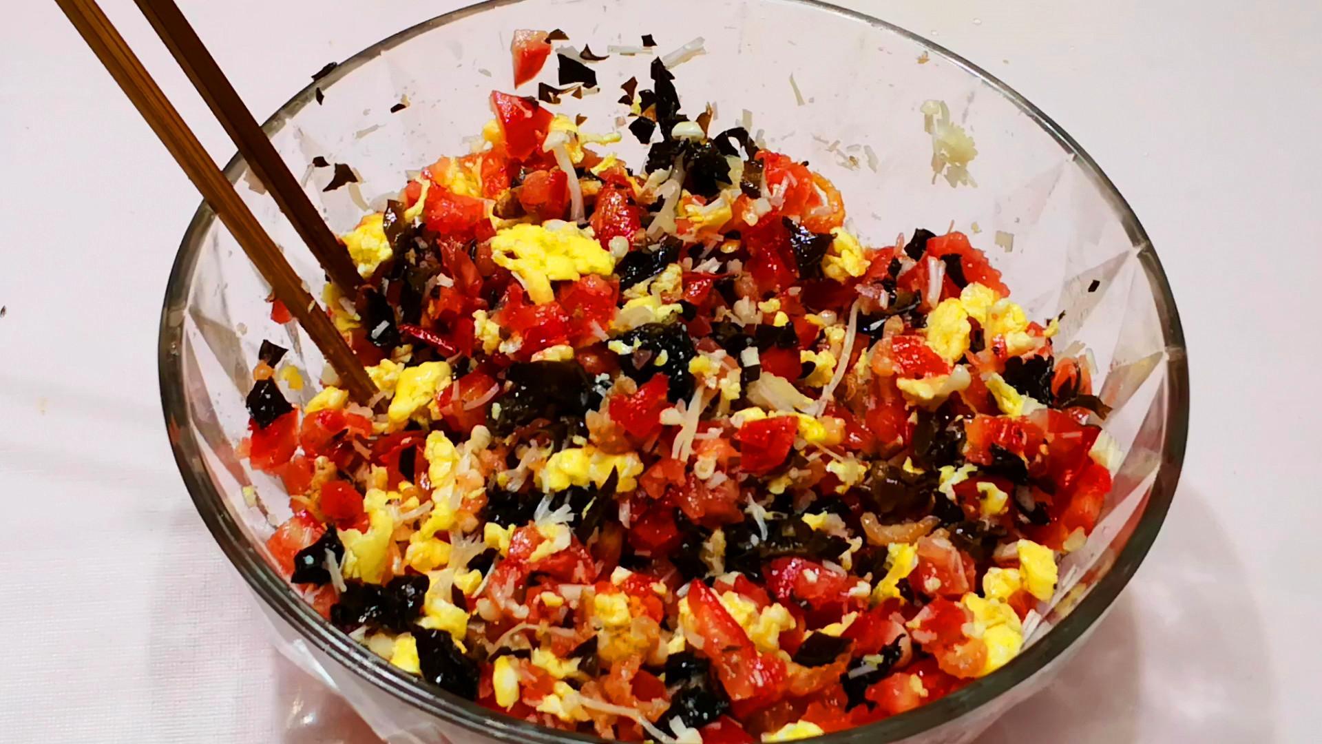 3、調餡:西紅柿餡水餃一般都是素餡,主要是和雞蛋和木耳等搭配。一把金針菇去根後切細備用;一把木耳溫水泡發後再焯水,然後控幹水分後剁細;2個雞蛋打散後煎成雞蛋碎,幹蝦仁一小把用溫水泡軟,然後將所有的餡料食材一起放到盆中,加入適量的鹽、胡椒粉、香油、食用油攪拌均勻,鮮美的西紅柿餃子餡就調好了。