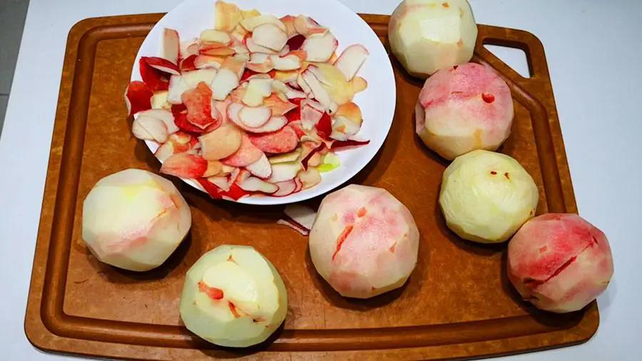 4.然後我們再起鍋加水,水量和桃子量的比例爲1:1,把之前削掉的桃子皮丟到鍋中,大火燒開後轉中火繼續煮,煮至桃子皮的顏色變淺,鍋中的水變粉時關火,把桃子皮控水撈出扔掉不要,這樣桃子皮中的糖分和營養就都會留在湯汁中了。