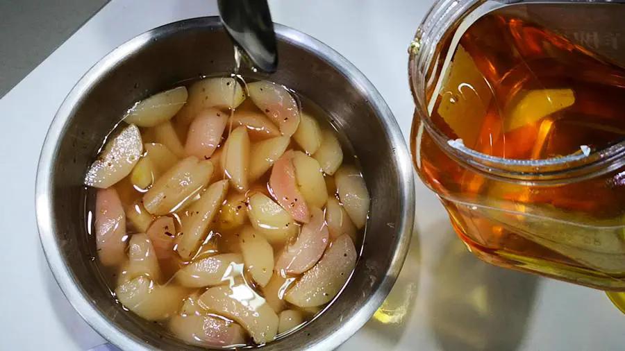 桃子盛出晾至不燙嘴時,再加入適量的蜂蜜攪拌均勻,不喜歡太甜的也可以不加。然後把桃子罐頭裝到無水無油的容器中,密封好後放到冰箱中冷藏保存,喫的時候取出來,挖一些倒入碗中,清涼爽口,炎炎夏日用來解暑真的是太過癮了!