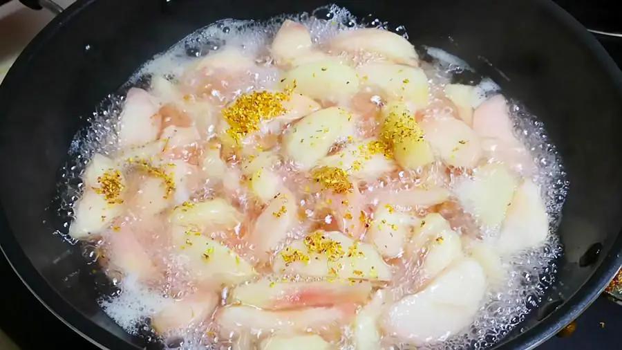 6.時間到了後關火,出鍋前再撒上適量的幹桂花,桂花是點睛之筆,加上它不但看着顏值更高、更有食慾,而且香甜味也更濃郁。