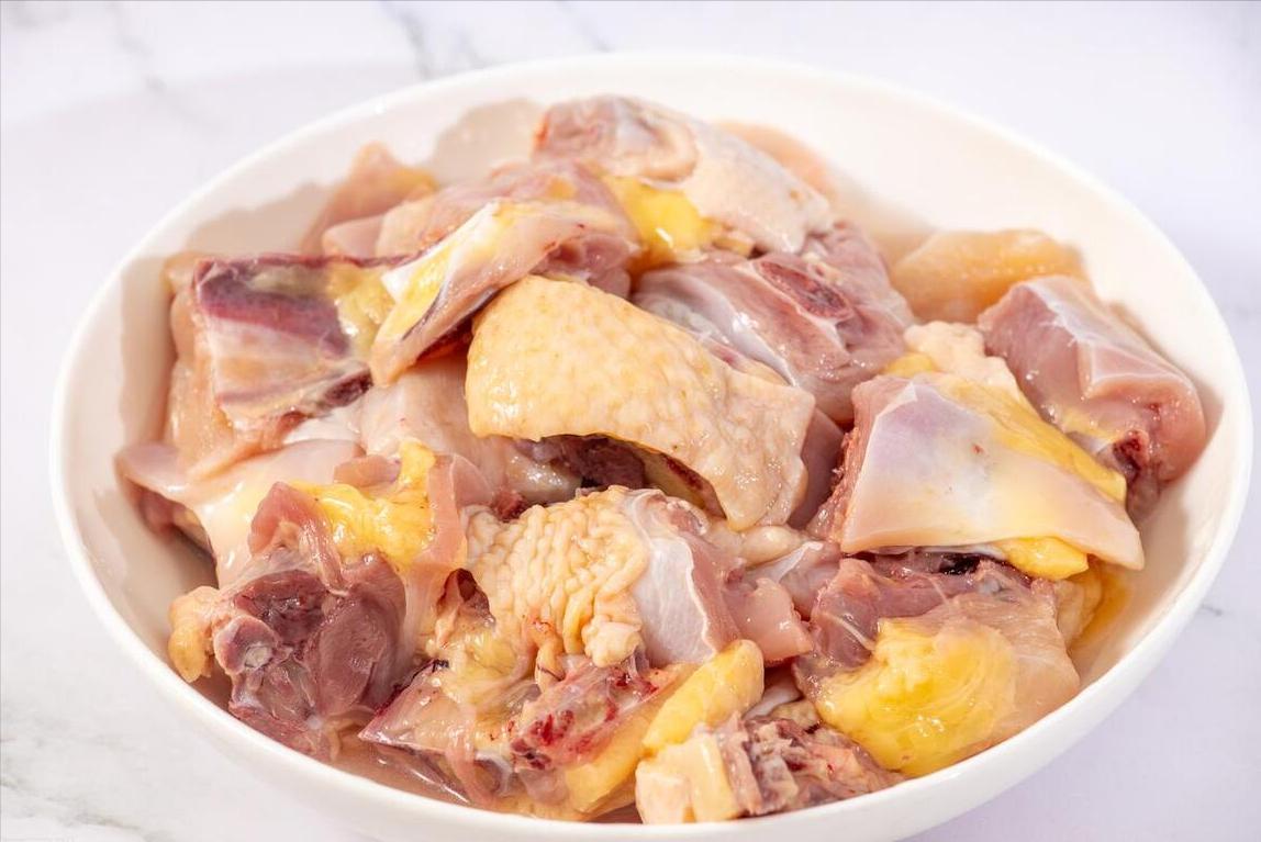 2、買來的雞肉,剁成塊以後,直接放在水中,不需要清洗,直接用水浸泡30分鐘的時間。泡好後的雞肉,當然啦如果有時間的話,能泡上1個小時的時間,那更好不過,泡好了之後多衝洗幾遍。