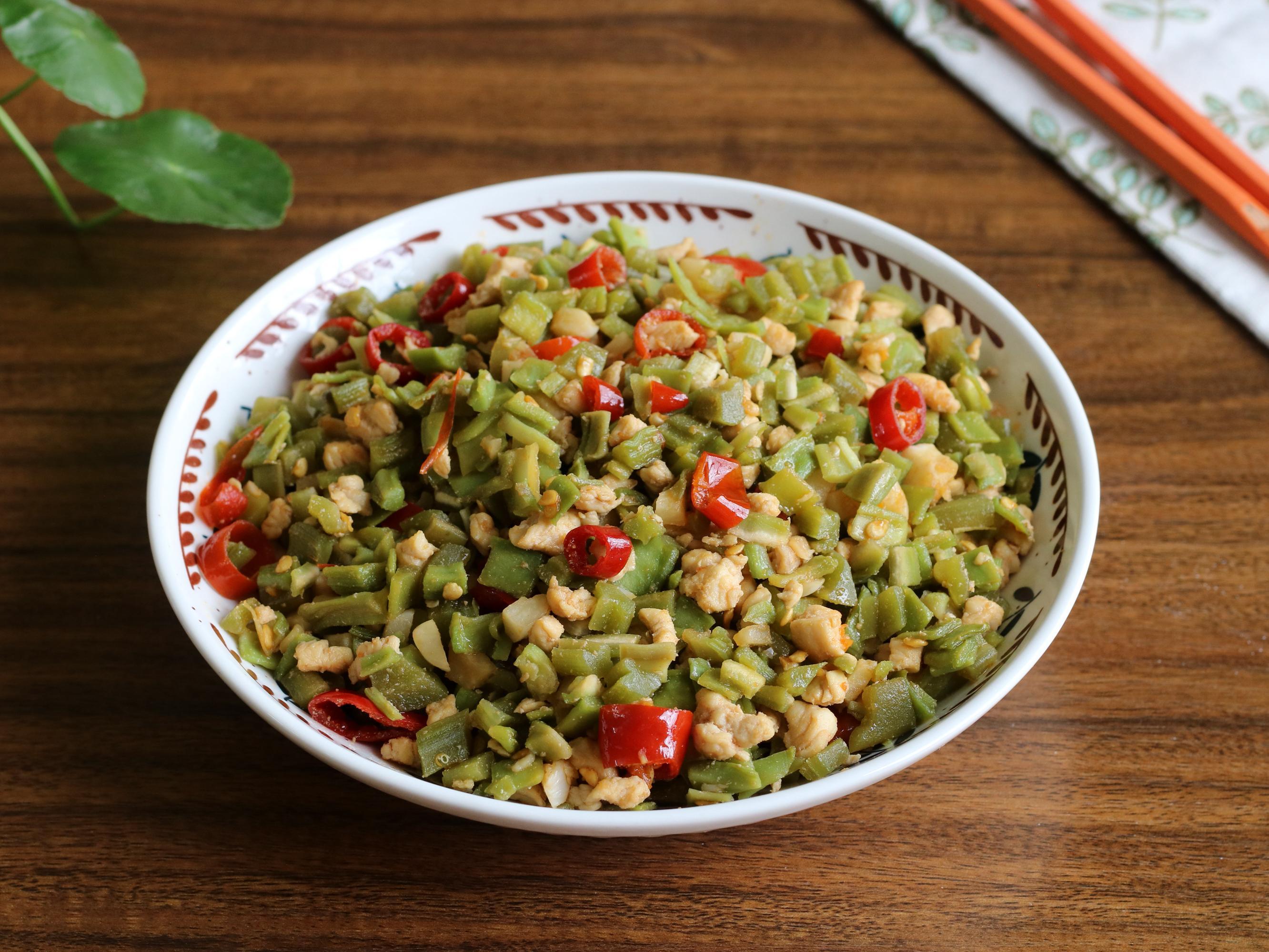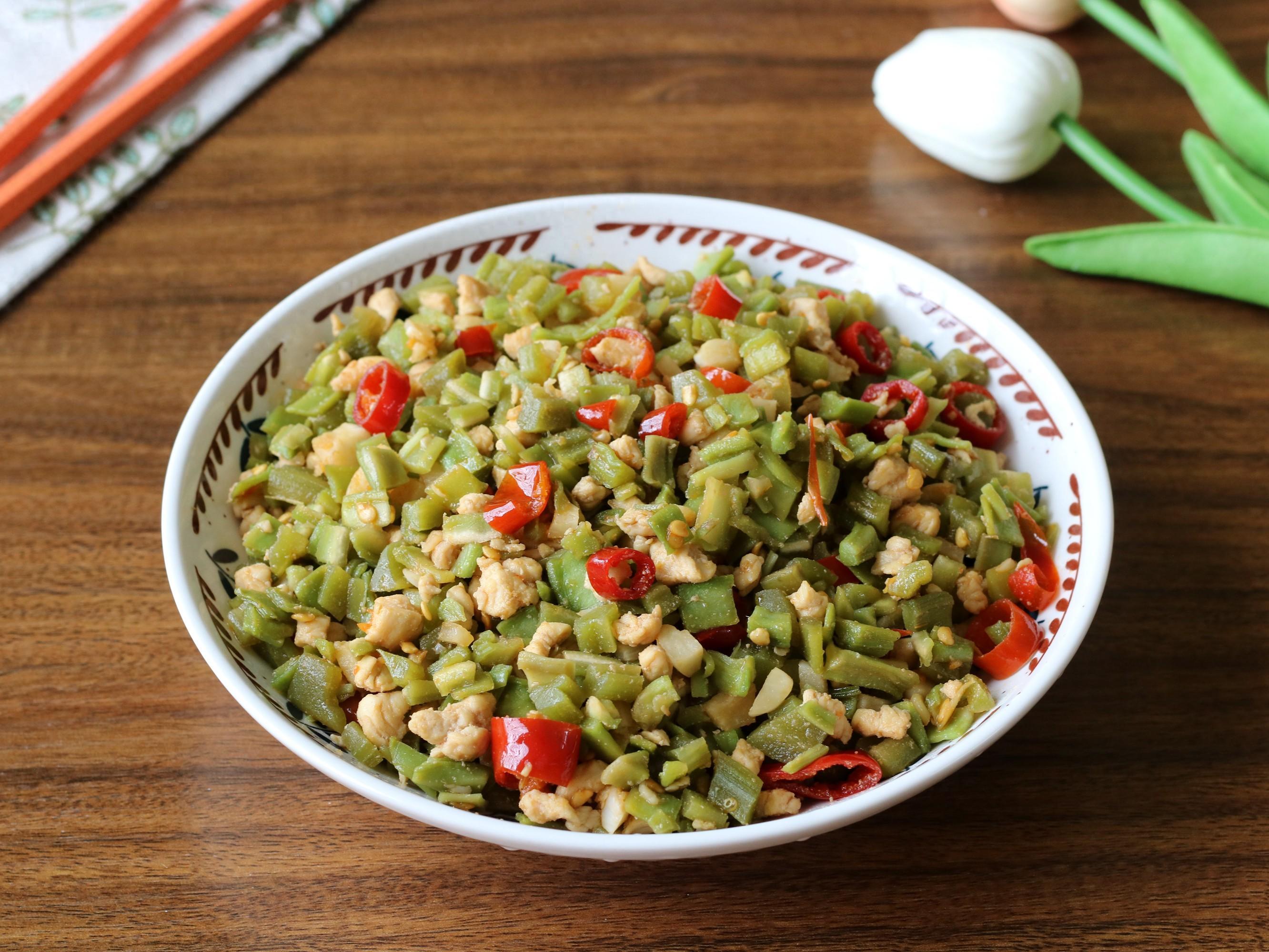 加入擠幹水分的貢菜乾,跟雞胸肉一起翻炒均勻,加適量的鹽調味。
