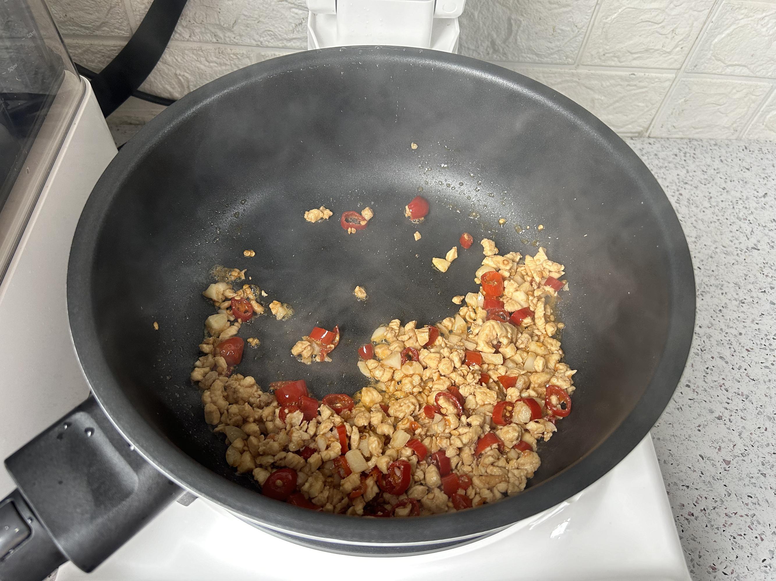熱鍋放油,放入雞胸肉丁翻炒到熟透,加入生抽翻炒到微微上色。