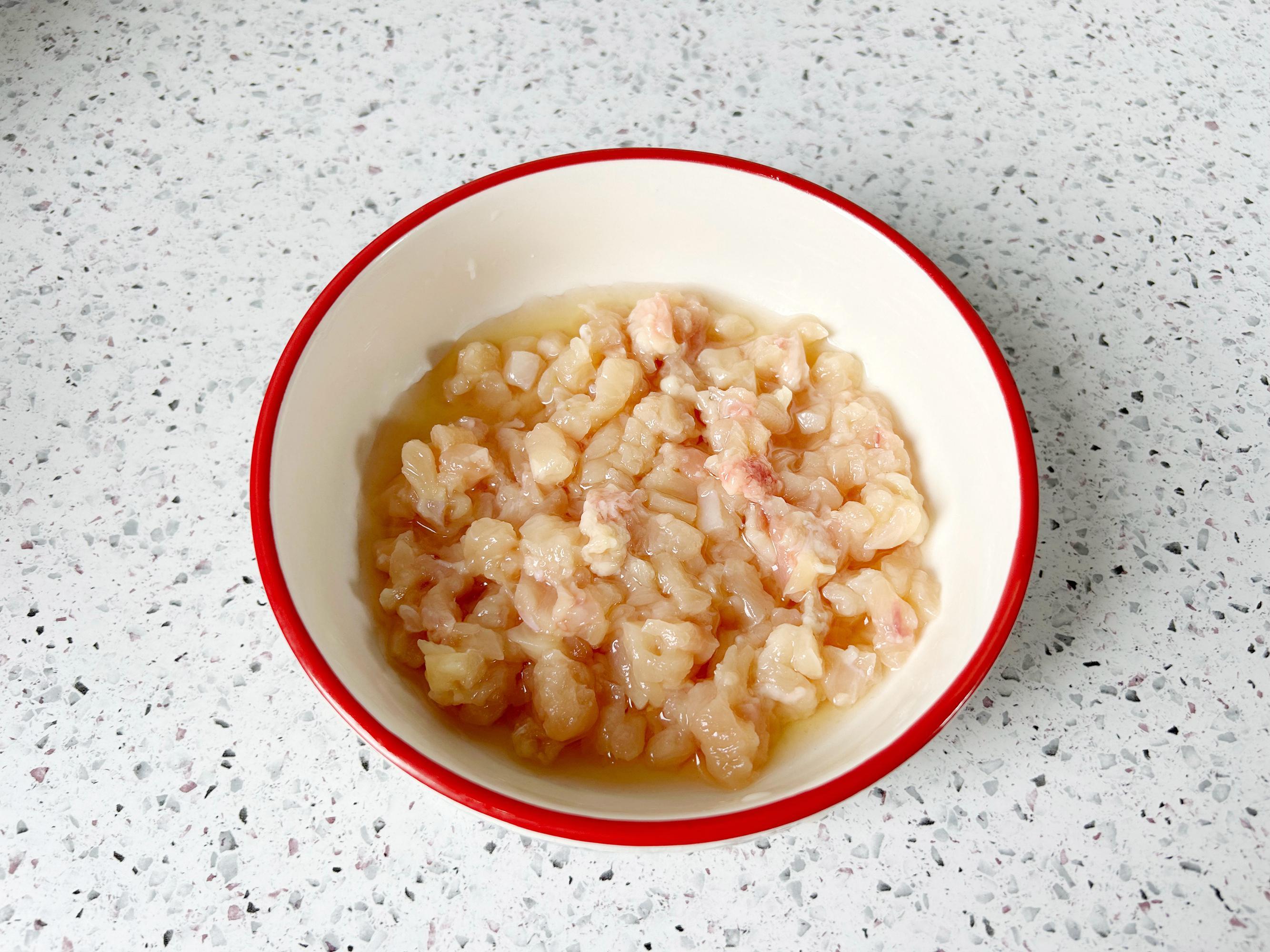 雞胸肉撕掉表面的薄膜,清洗乾淨,切成玉米粒大小,加入一大勺料酒醃製10分鐘,倒掉水分。