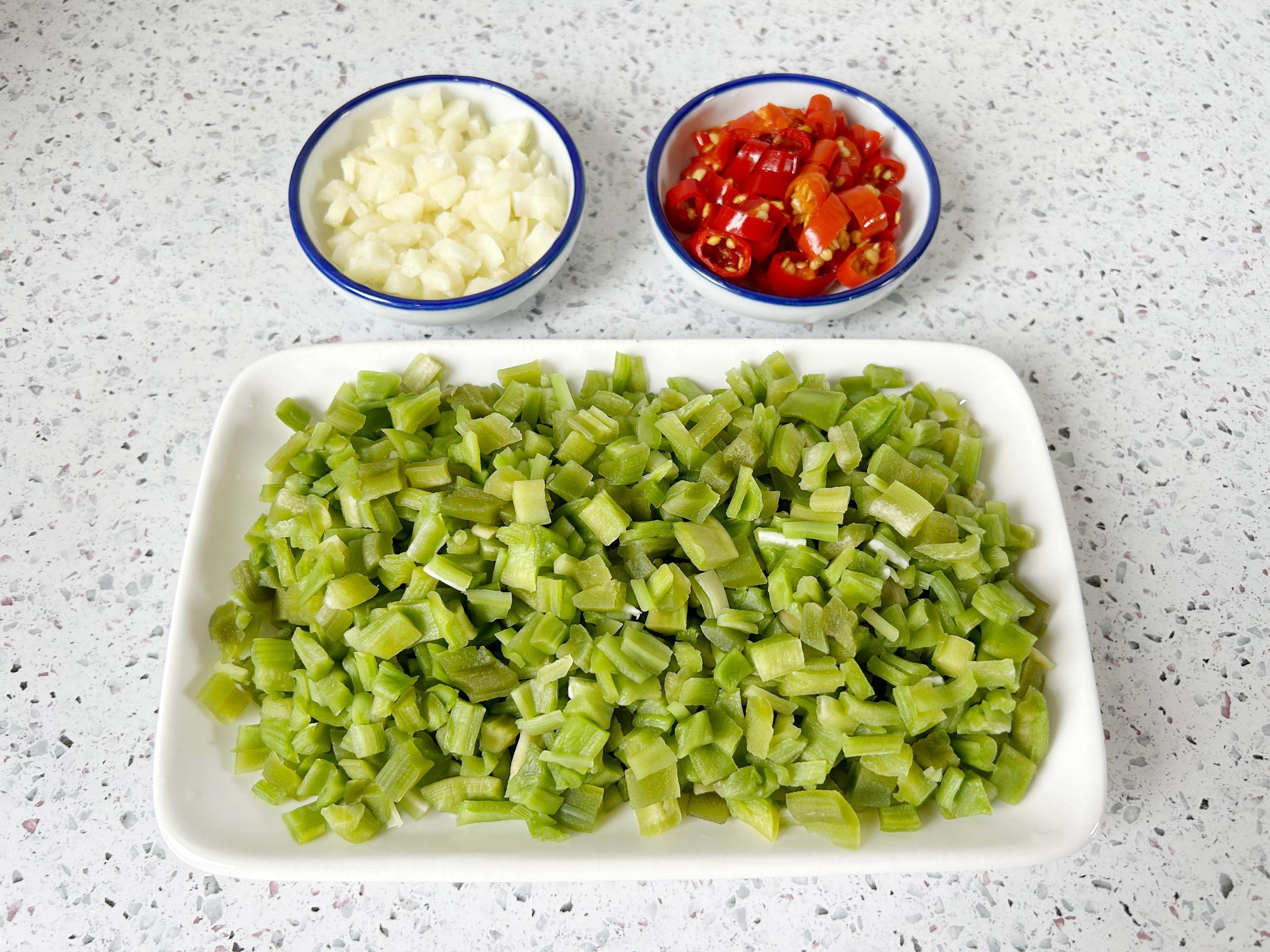 貢菜乾用溫水泡發,攥幹水分,切成玉米粒大小,大蒜拍扁去皮切顆粒,泡椒切成圓圈。
