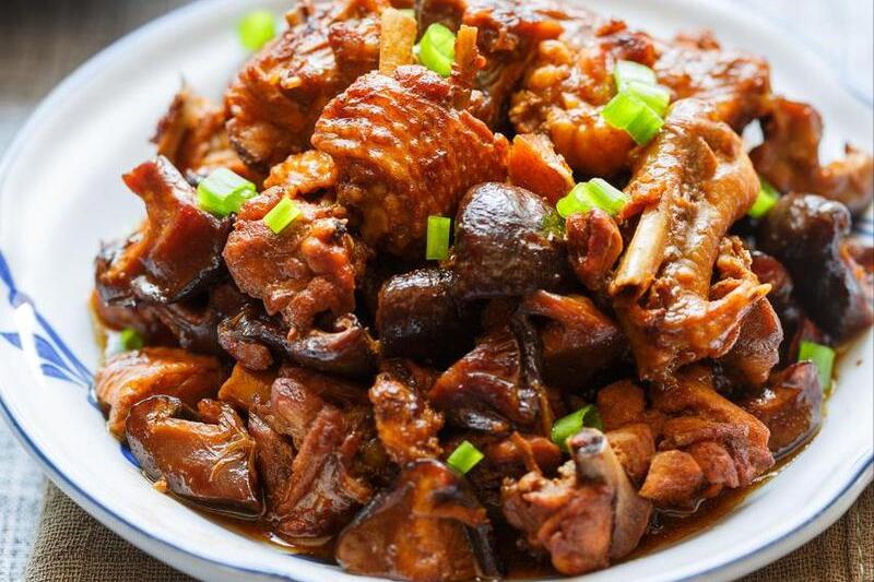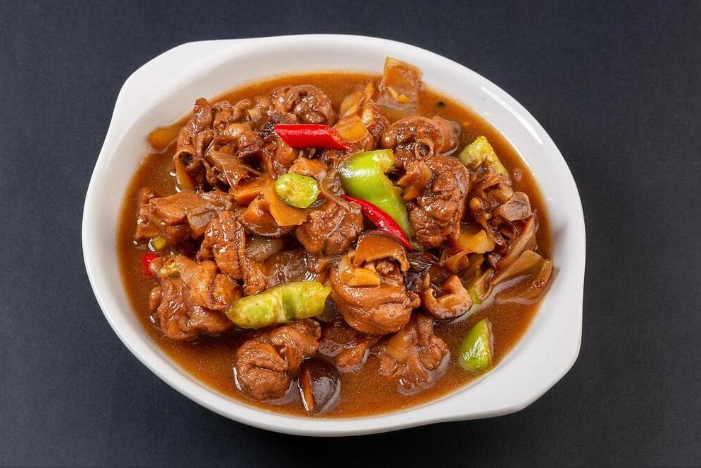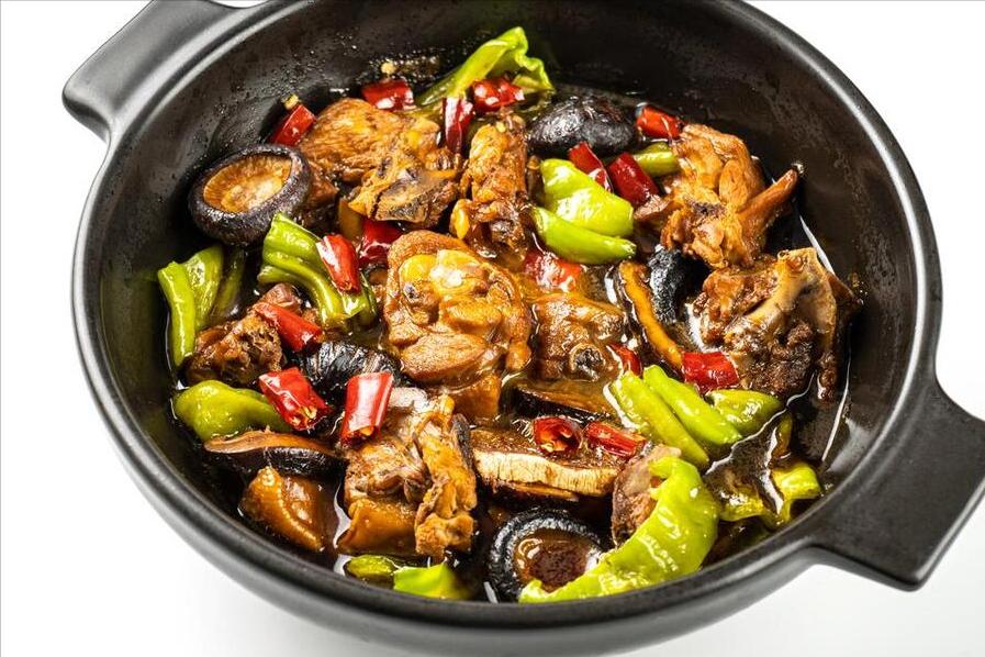 2、鍋內倒油燒熱,放上蔥姜炒香,然後倒入雞塊翻炒,炒到變色以後加上生抽、老抽、料酒調味,接着加入適量的開水,大火燒開之後改爲小火燉40分鐘,隨後再加上香菇、胡蘿蔔繼續燉20分鐘,最後倒上青辣椒,再來點鹽、雞精調味,大火收汁出鍋。