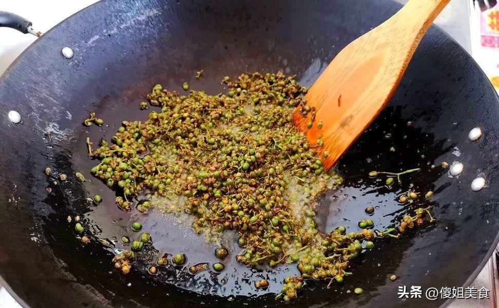 2. 在鍋中加入適量的食用油,待油熱後,放入洗淨的鮮花椒,小火慢炒,炒至花椒變色出香味,然後將花椒撈出,只留油在鍋中。
