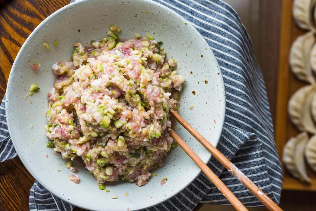 食材:西葫蘆、雞蛋、蔥花、鹽、雞精、白糖、蠔油、香油、餃子皮