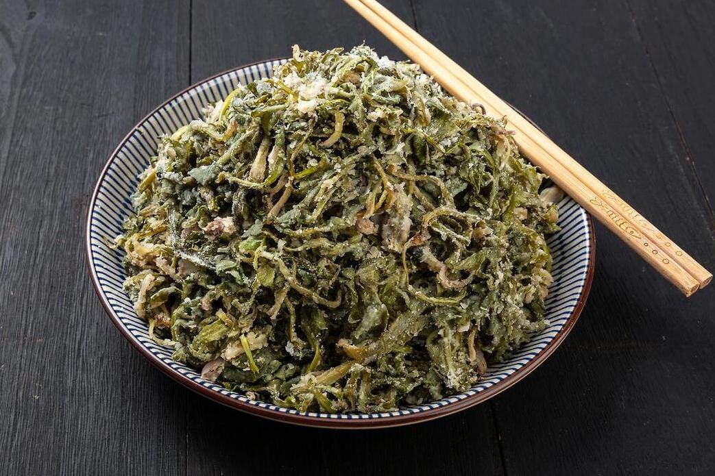 食材:芹菜葉子、麪粉、玉米麪粉、蒜末、鹽、雞精、香油、辣椒油