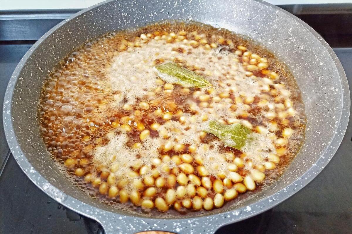 3、緊接着放上點香葉、桂皮、八角,再來2g小蘇打,加上它可以讓黃豆煮出來更加軟糯。加上這些東西以後,將蓋子蓋上,然後開火開始煮,大火燒開之後,改爲小火煮30分鐘的時間。