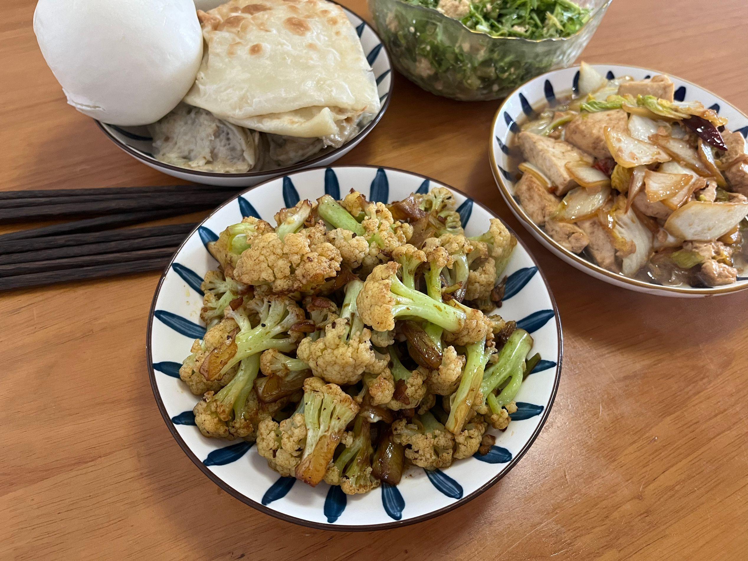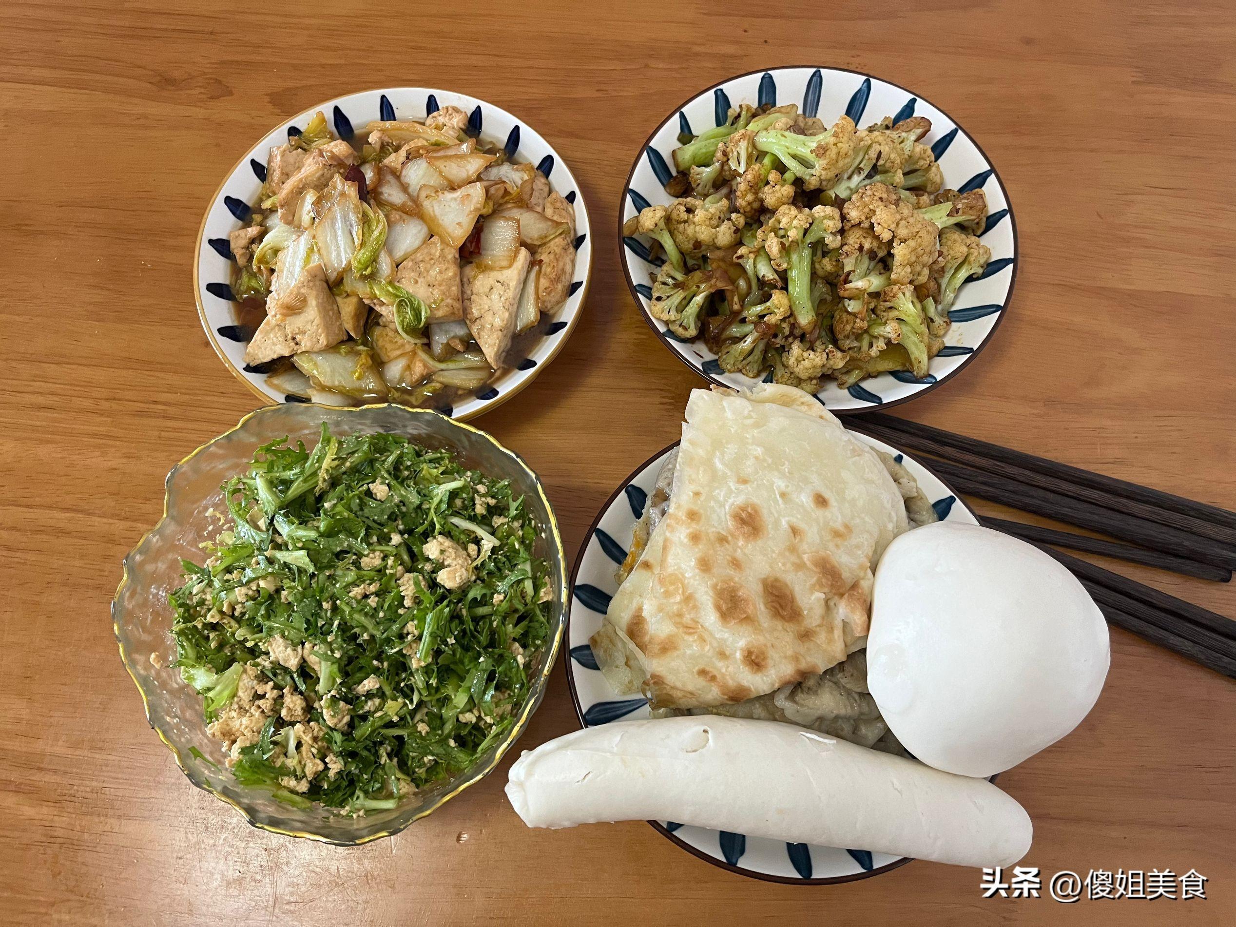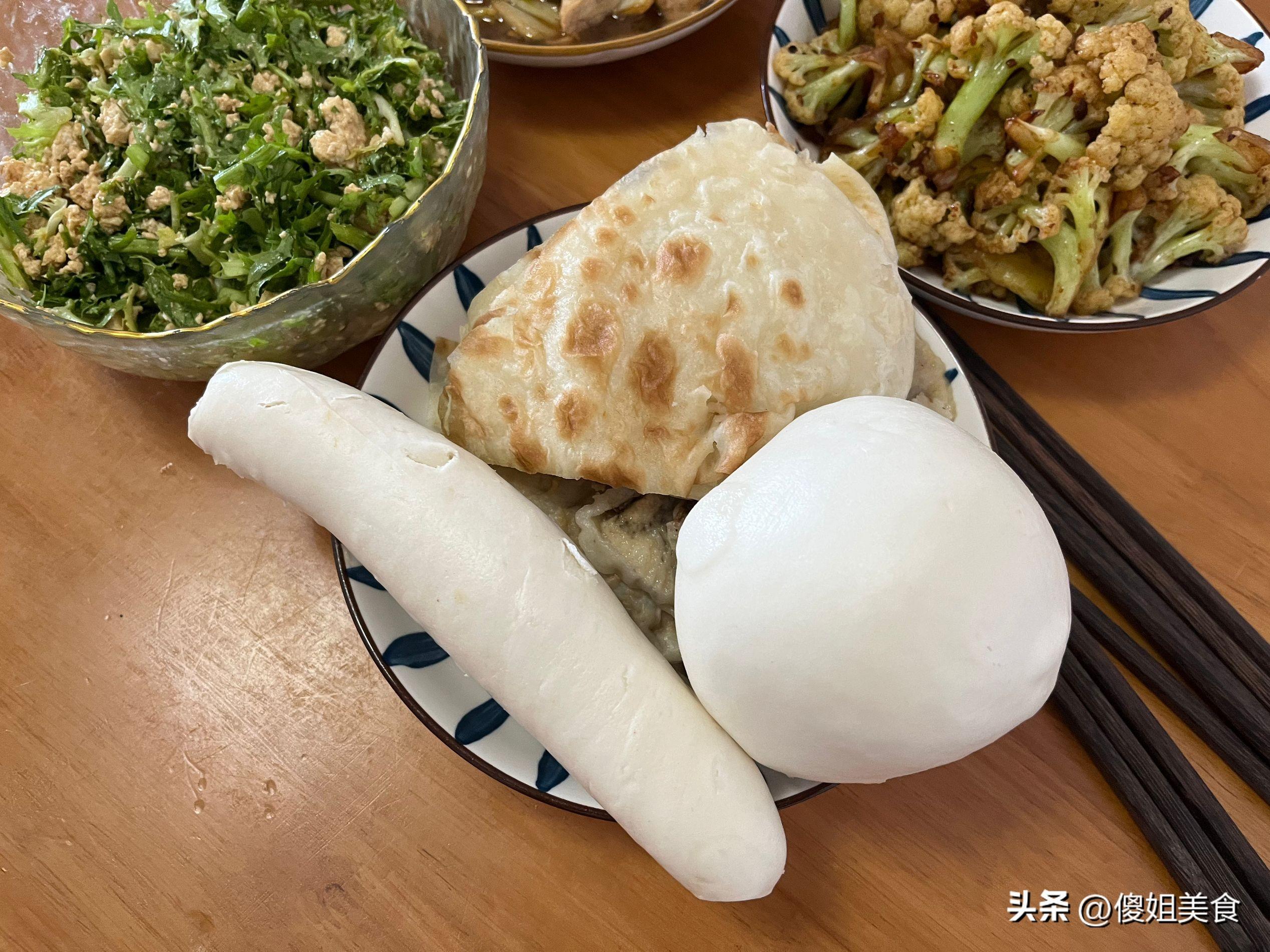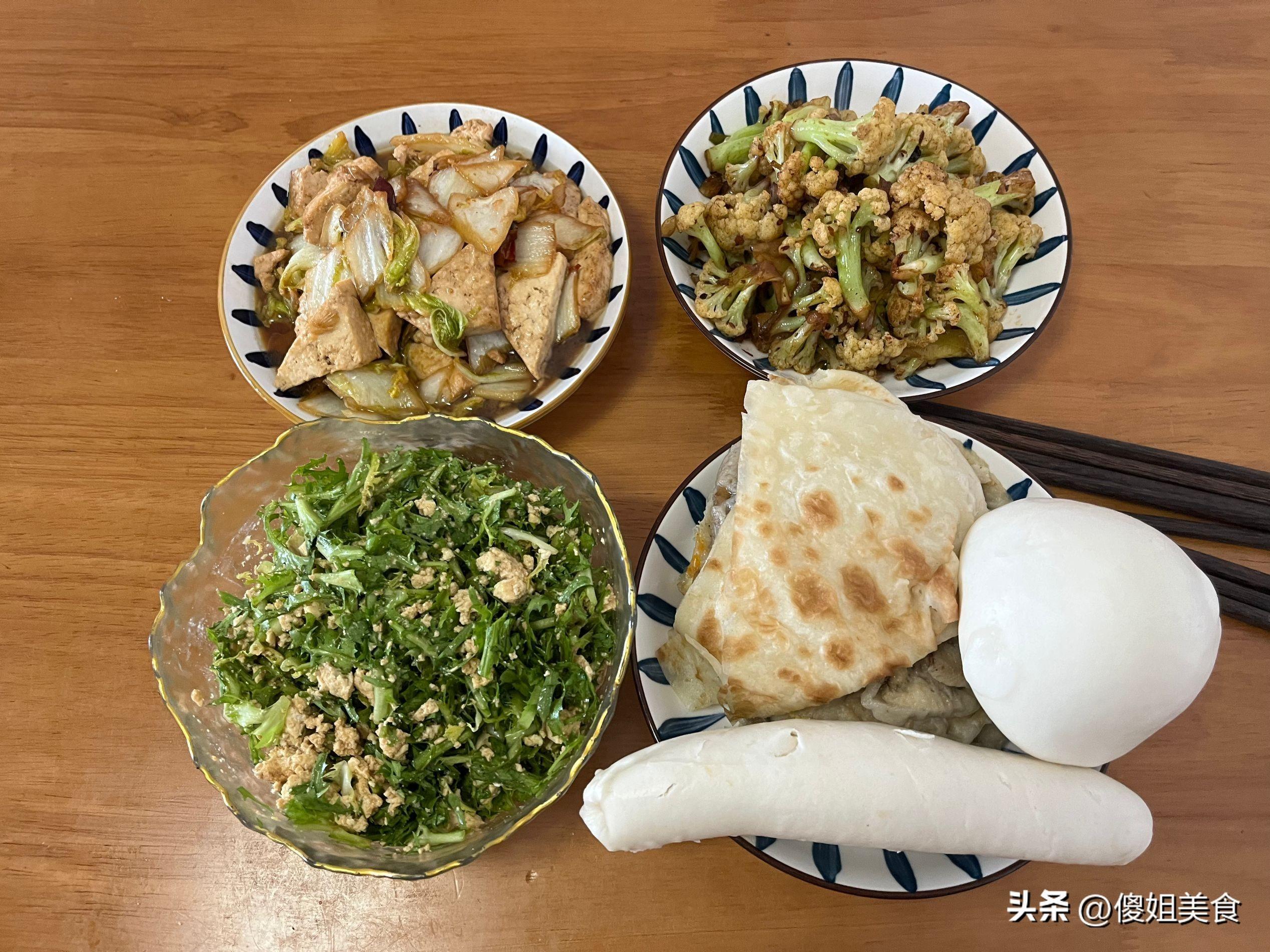 主食就是我自己蒸的饅頭和烙的大餅,都在冰箱裏一點一點的,我打掃了一下全部拿出來,蒸了一下,可以湊合喫一頓。