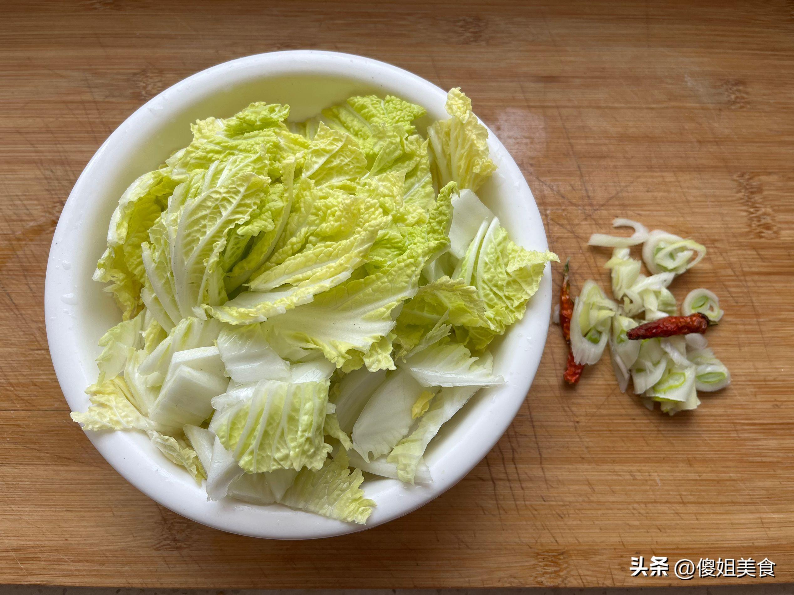 大白菜這會比冬天的時候都要便宜很多,一塊錢三斤,還是老農自己種的,幾乎不達農藥,花1.5元買了一棵,買回來的大白菜把菜葉掰下來,用清水洗淨後切成零形狀。然後再準備一些蔥花、幹辣椒段備用就可以。