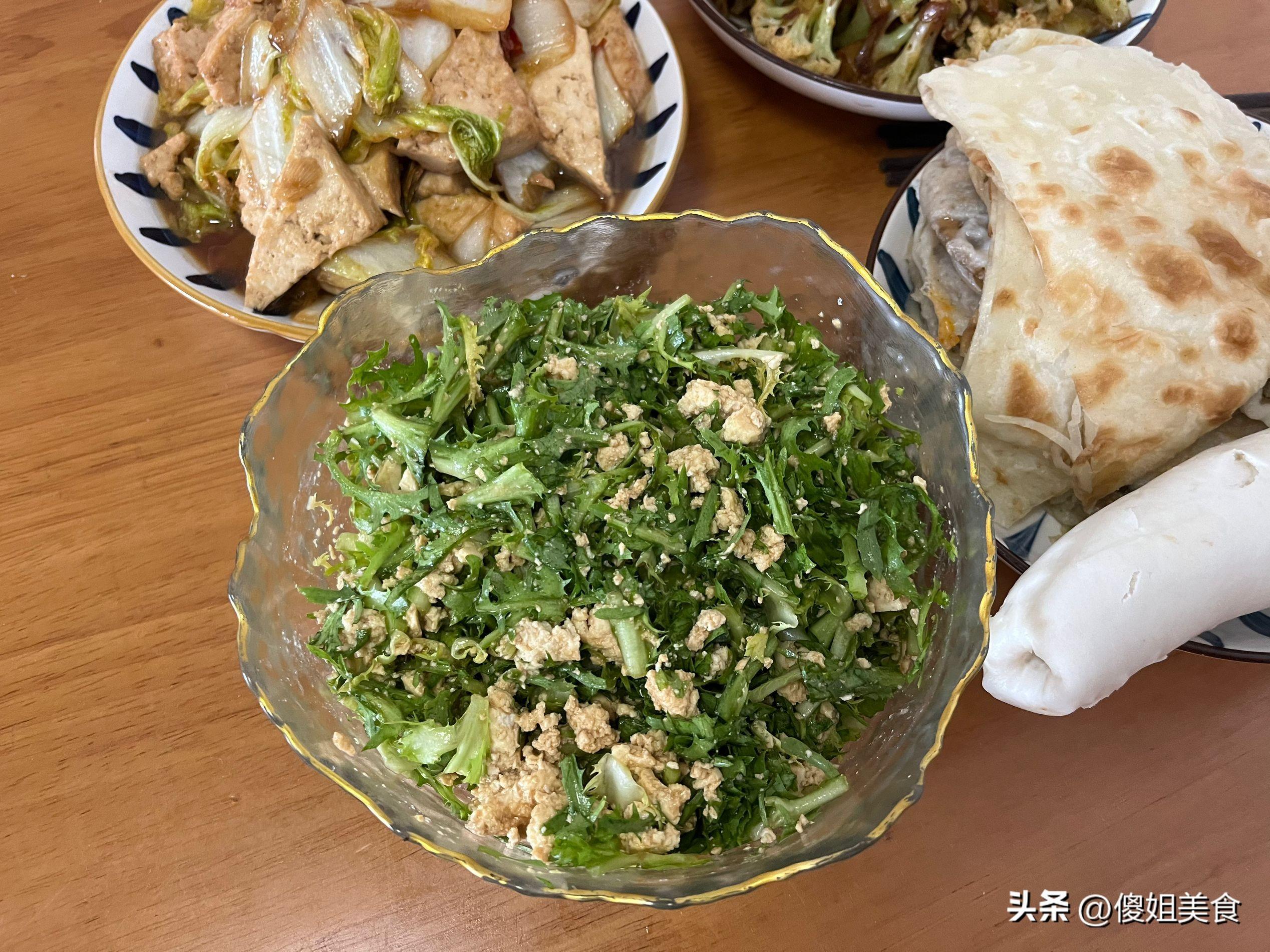 花3塊錢買了一大把苦菊,夏天涼拌個苦菊喫很去火又爽口,買回來的苦菊洗了一顆,切掉根蒂後改刀切成小段放入小碗內,又放了5毛錢的豆腐,用乾淨的手把豆腐捏碎,到點醬油醋和香油簡單的拌一拌就能喫,爽口好喫,也是老公愛喫的下酒菜。