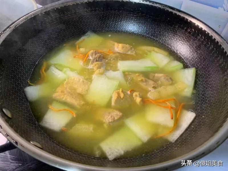 2、將處理好的排骨放入鍋中,加水,大火燒開後轉小火慢燉約1小時,直至排骨軟爛。將切好的冬瓜塊和竹蓀一同放入鍋中,繼續小火燉煮約20分鐘,直到冬瓜變得透明軟糯。