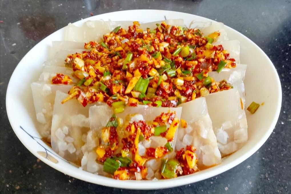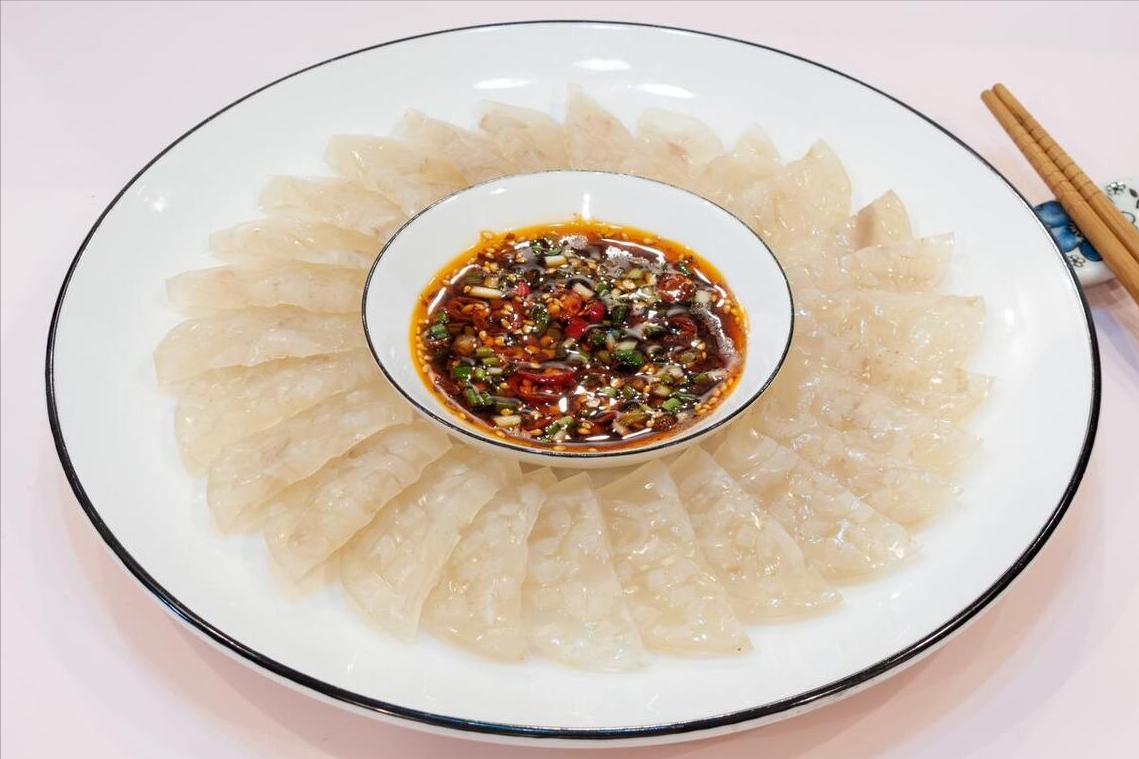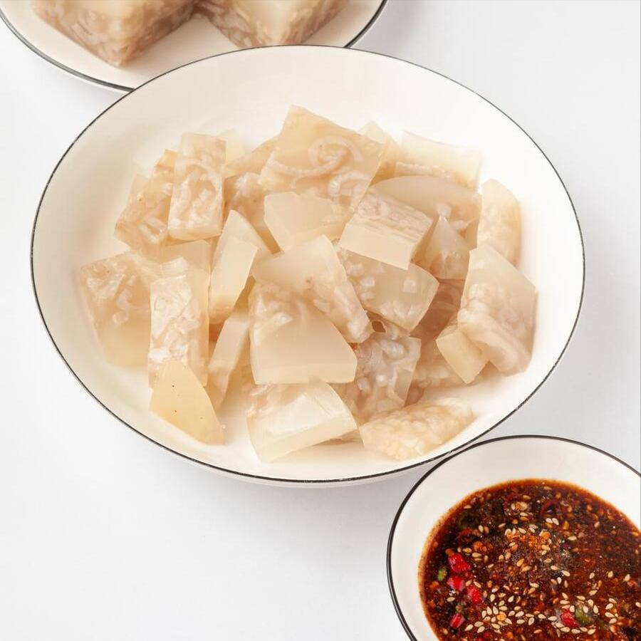 只要一來客人,就能享用到晶瑩剔透的豬皮凍,不僅看上去漂亮,喫起來更是美味。蘸着蒜蓉蘸料,一口下去滑溜溜的,越嚼越香。當然了,也有不少朋友接受不了它的口感,咱們也不強求哈,畢竟每個人的口味不同。
