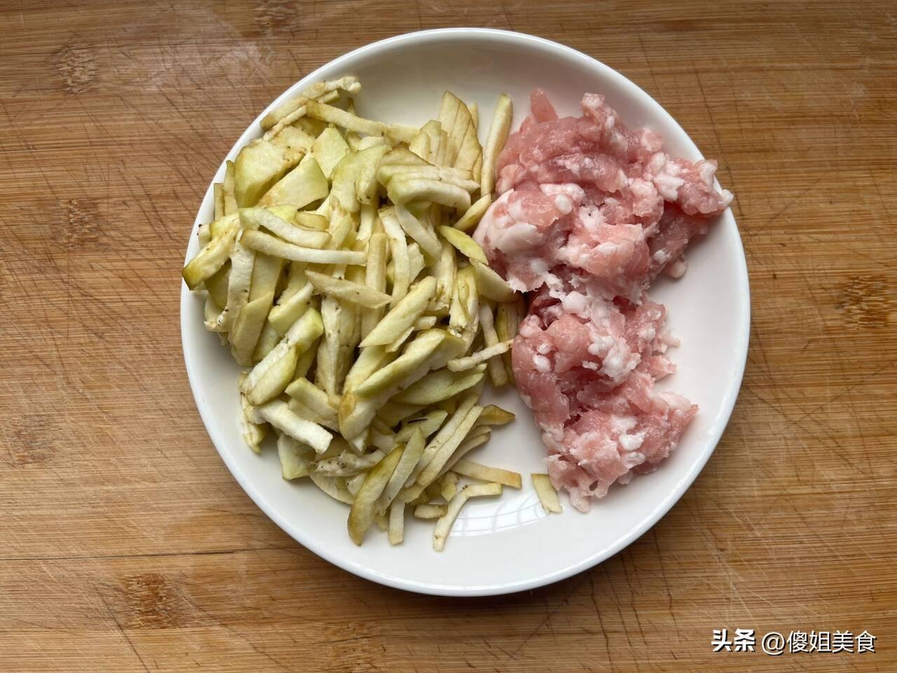 茄子是自己家種的,不用花錢隨便喫,準備半個去皮的茄子,改刀切成細長條,然後茄子再用清水洗幾遍,洗出裏面的黑水。接下來就是準備一塊五花肉肉餡,五花肉炒熟後倍香,和茄子搭配一炒更好喫。