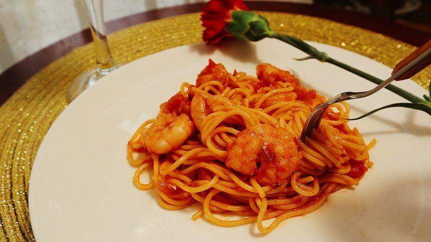 1、將蝦仁用少量橄欖油、鹽和黑胡椒醃製後煎熟,與番茄、洋蔥等蔬菜一起炒制,再加入煮熟的意麪攪拌均勻即可。