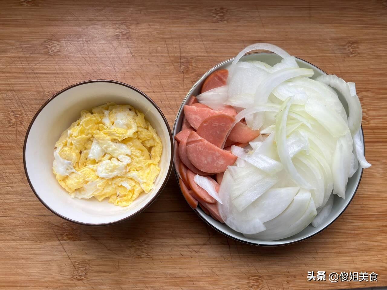 洋蔥現在很便宜,1塊錢2斤,準備一個洋蔥剝去幹皮,改刀切成細長條。然後再準備一小塊火腿腸,火腿腸還是兒子給帶回來的,是純肉腸,要20一斤呢,肉腸切成薄片。最後用炒鍋滑炒3個笨雞蛋,滑炒熟盛入小碗內,把所有食材放入小碗內就可以。