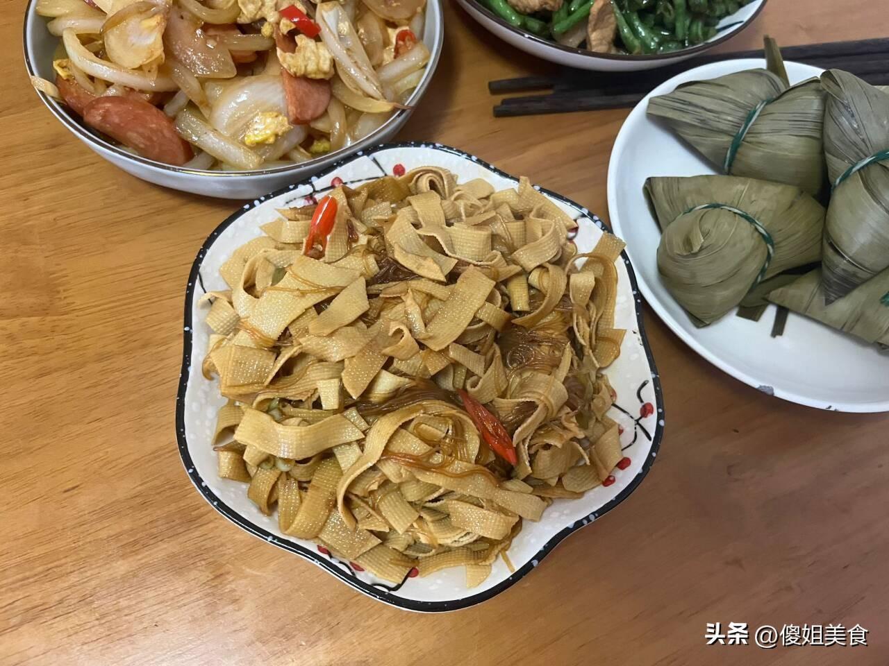 兒子回來時買了5塊錢的豆腐皮也沒有喫到,都幹吧了,切了切用辣椒一炒,放了點粉絲,香辣可口,越嚼越香,我們老兩口還喝了3兩白酒。老兩口吃好了,簡單好喫又實惠。