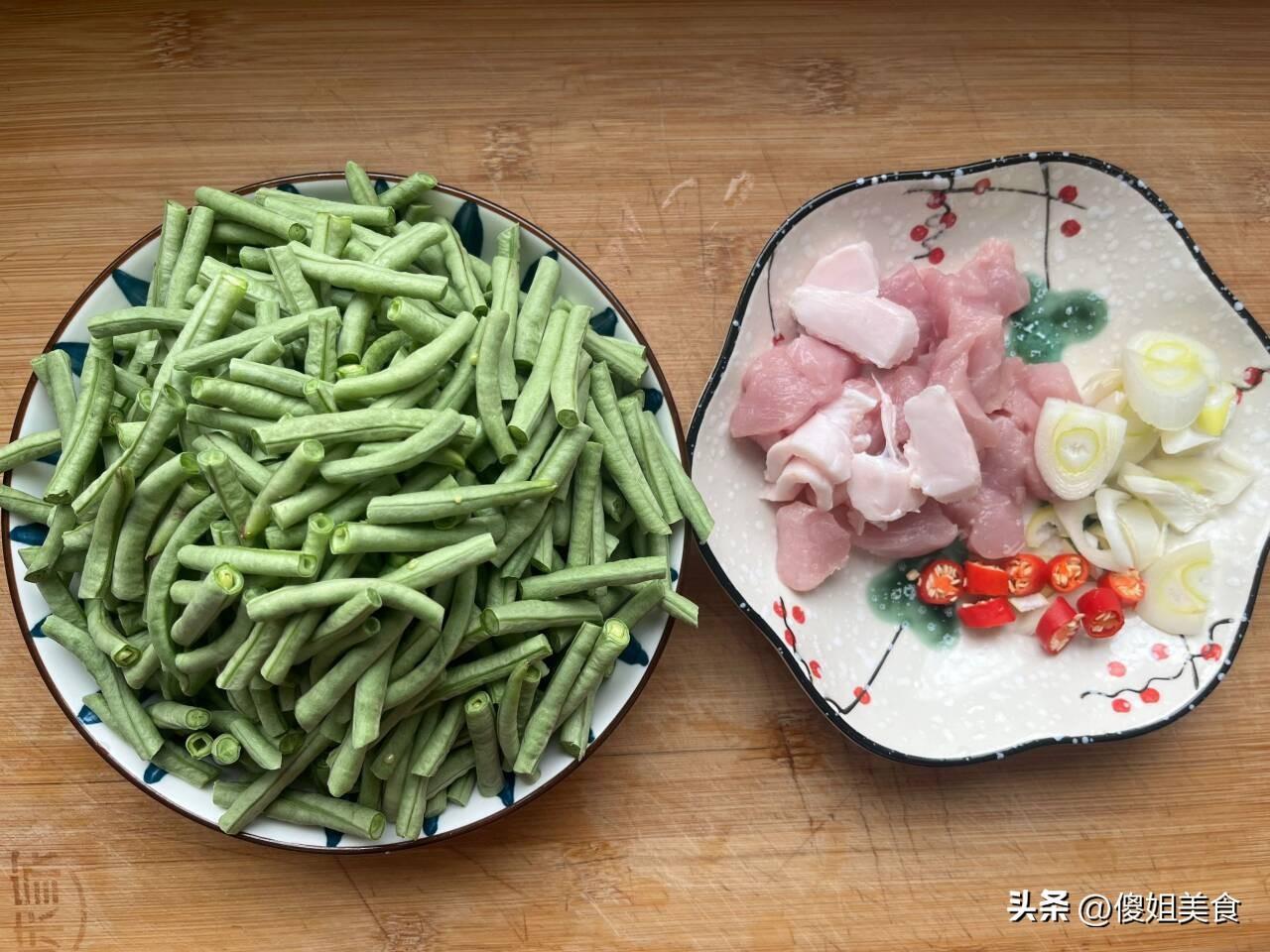 豆角我家有的是,小菜園一茬接一茬,根本喫不完,準備2塊錢的豬肉洗淨後切成薄片,再準備一些蔥花、小米辣切碎。最後把長豆角切成小段後洗乾淨,撈出來控水備用。