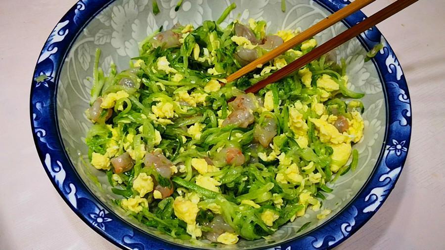 3、把晾涼的雞蛋碎、醃製好的蝦仁全都放入黃瓜餡中,再把切好的蔥花和薑末也加入,然後加入適量的食鹽、雞精、一勺蠔油、少許花椒油和香油調味,用筷子完全攪勻即可。