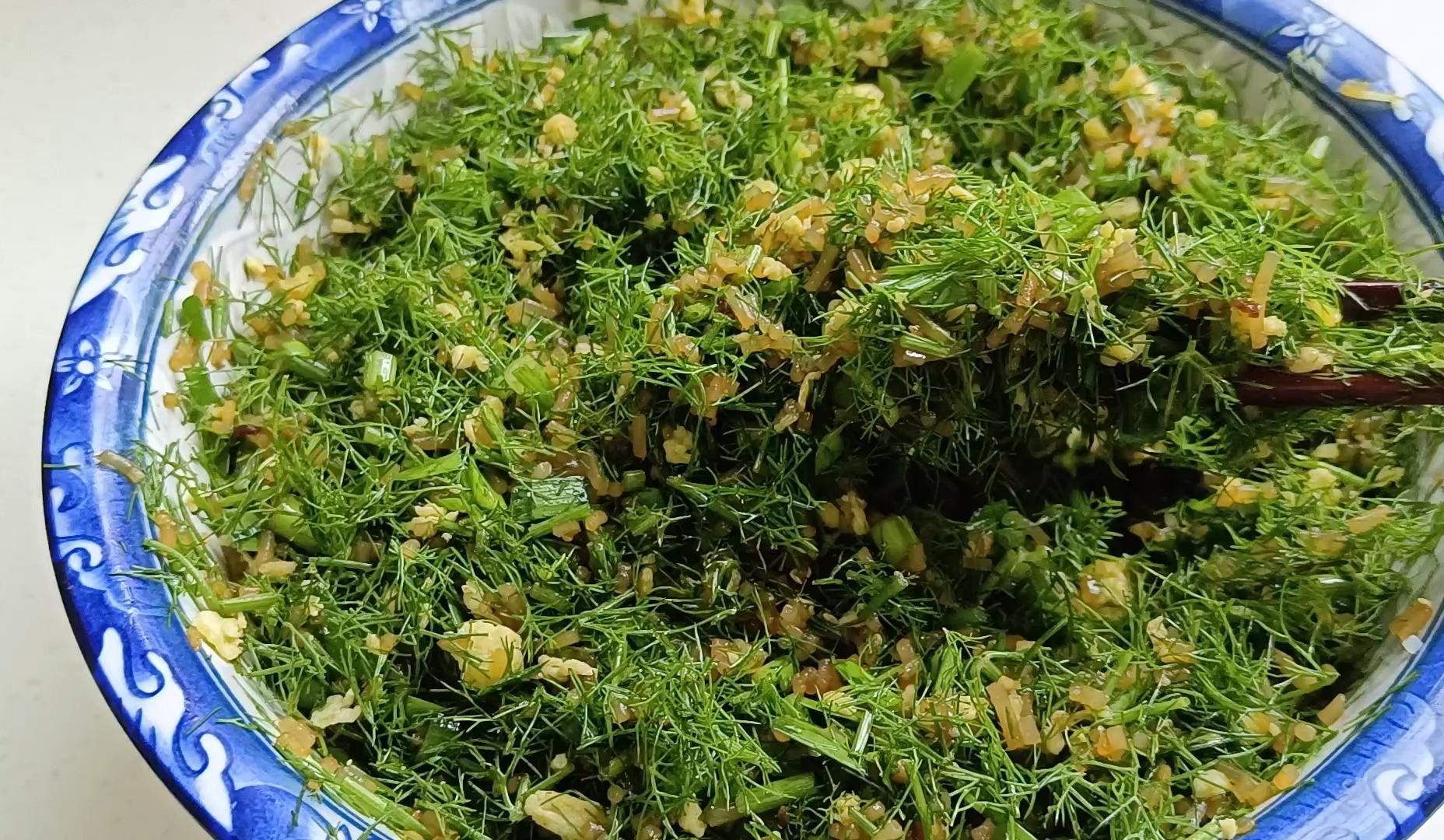 1、新鮮的茴香要清洗乾淨,瀝乾水分後切掉前面較硬的部分,然後切細放入盆中;一把粉絲放到熱水中泡軟後撈出過涼,剁細備用;起鍋加油,油溫五成熱放入蔥花和薑末,炒香後再倒入切細的粉條,加少許老抽、2勺生抽,翻炒至粉條變色入味後關火,晾涼備用。