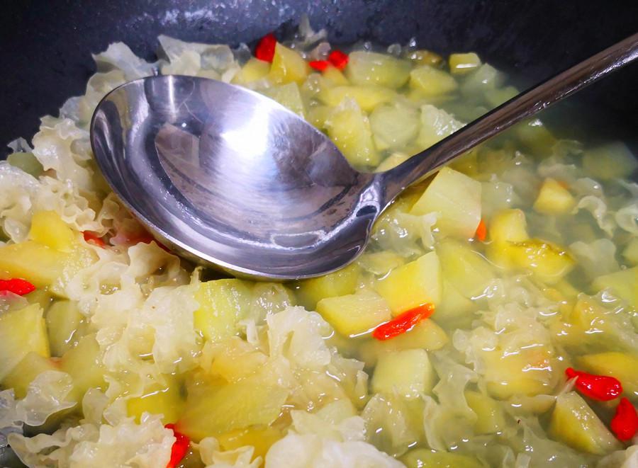 3.鍋中加入適量清水,然後將雪蓮果和銀耳倒入,大火燒開後轉中小火後慢慢煮,大約煮40分鐘左右,看到湯汁變濃稠時,加入一把枸杞、一把冰糖,繼續煮10分鐘左右,即可關火出鍋,美味即成!