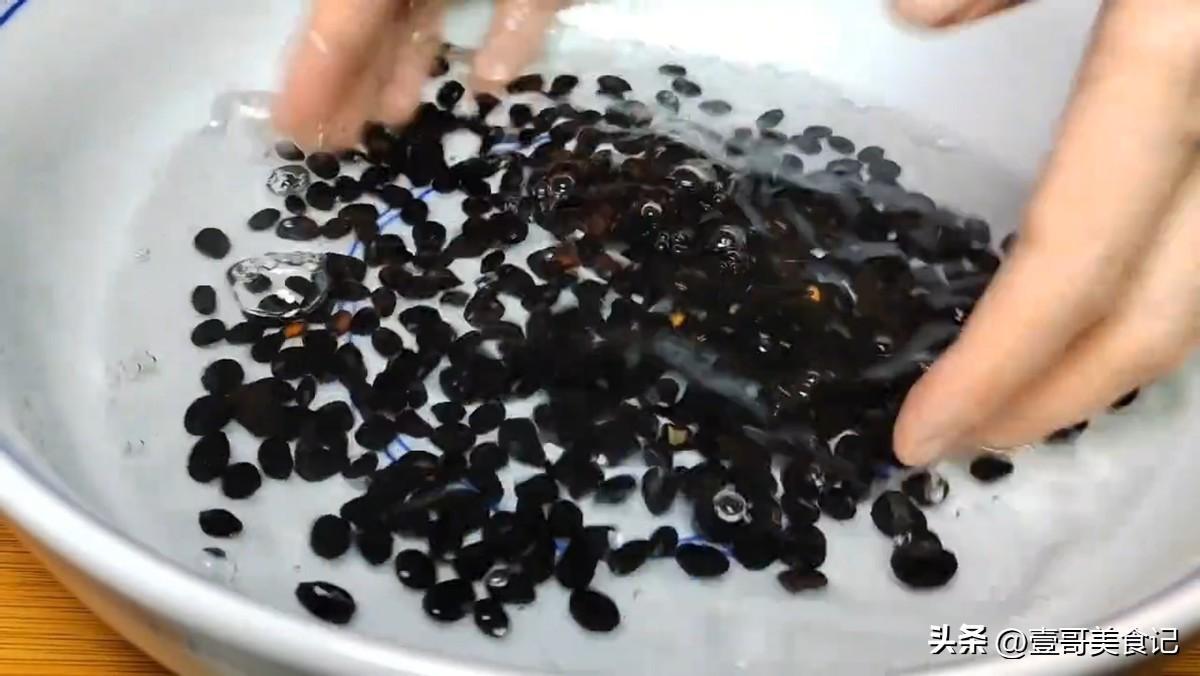 爲了徹底清潔黑豆並使其更容易煮爛,我們需要進行第二次清洗。向碗中加入清水,輕輕攪拌黑豆,直至水變得清澈。然後,倒掉清水,加入新的清水浸泡黑豆約10分鐘。注意,浸泡時間不宜過長,以免黑豆的營養物質流失。