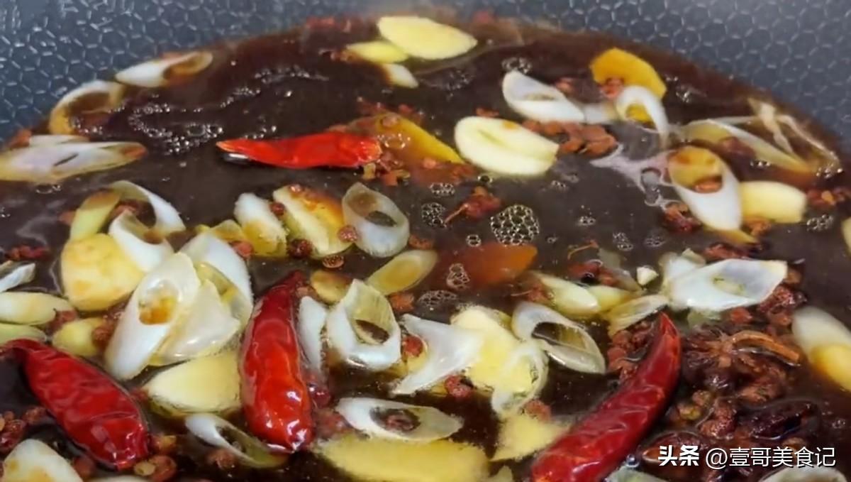 第九步,製作料汁。鍋中留底油繼續加熱,等油熱了,將準備好的調料全部倒入鍋中,用鏟子攪動的進行炸制,要炸出香味來。炸香之後,把準備好的料汁全部倒入鍋中,開大火進行加熱,要讓料汁煮開。等鍋裏的料汁煮開,煮出香味之後,用漏勺將飄着的調料全部撈掉不要,只留下料汁。