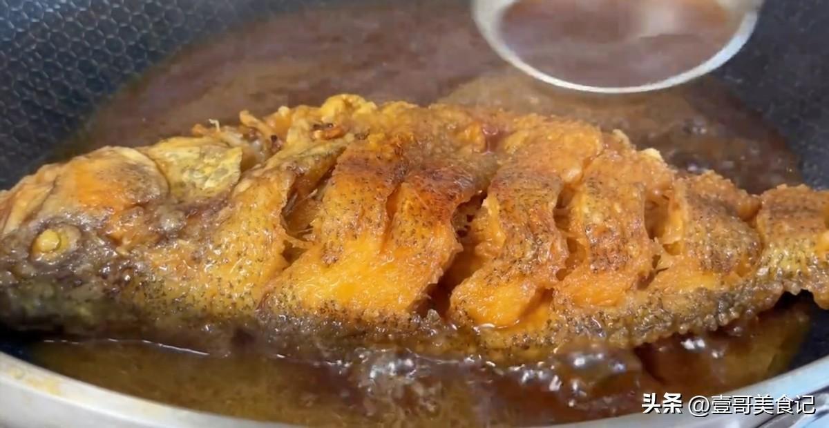第十步,燒魚。等料汁又開了,我們就可以將魚放入料汁中進行燒製了。在燒的過程中,我們先給鍋蓋上蓋子,讓魚肉在裏面燜上八分鐘,然後打開鍋蓋,不停的用鏟子將周圍的料汁澆在魚身上,要讓魚肉充分的吸收料汁。我們就這樣不停的將料汁澆在魚身上,直到鍋裏的湯汁完全收汁,就可以關火了。