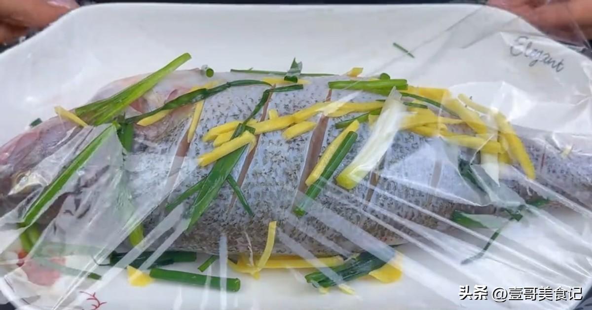 第四步,醃製魚肉。把切好的蔥姜放一些在魚身上,再稍微撒一點食鹽。然後,帶上一次性手套,按摩魚肉,要讓蔥汁和薑汁按摩進魚肉中,加入食鹽可以提前打底味。按摩的時候要注意,兩邊都要按摩到。按摩完之後,將蔥姜留在魚身上,肚子裏也塞進去一些,就可以用保鮮膜將魚蓋住,包15分鐘。