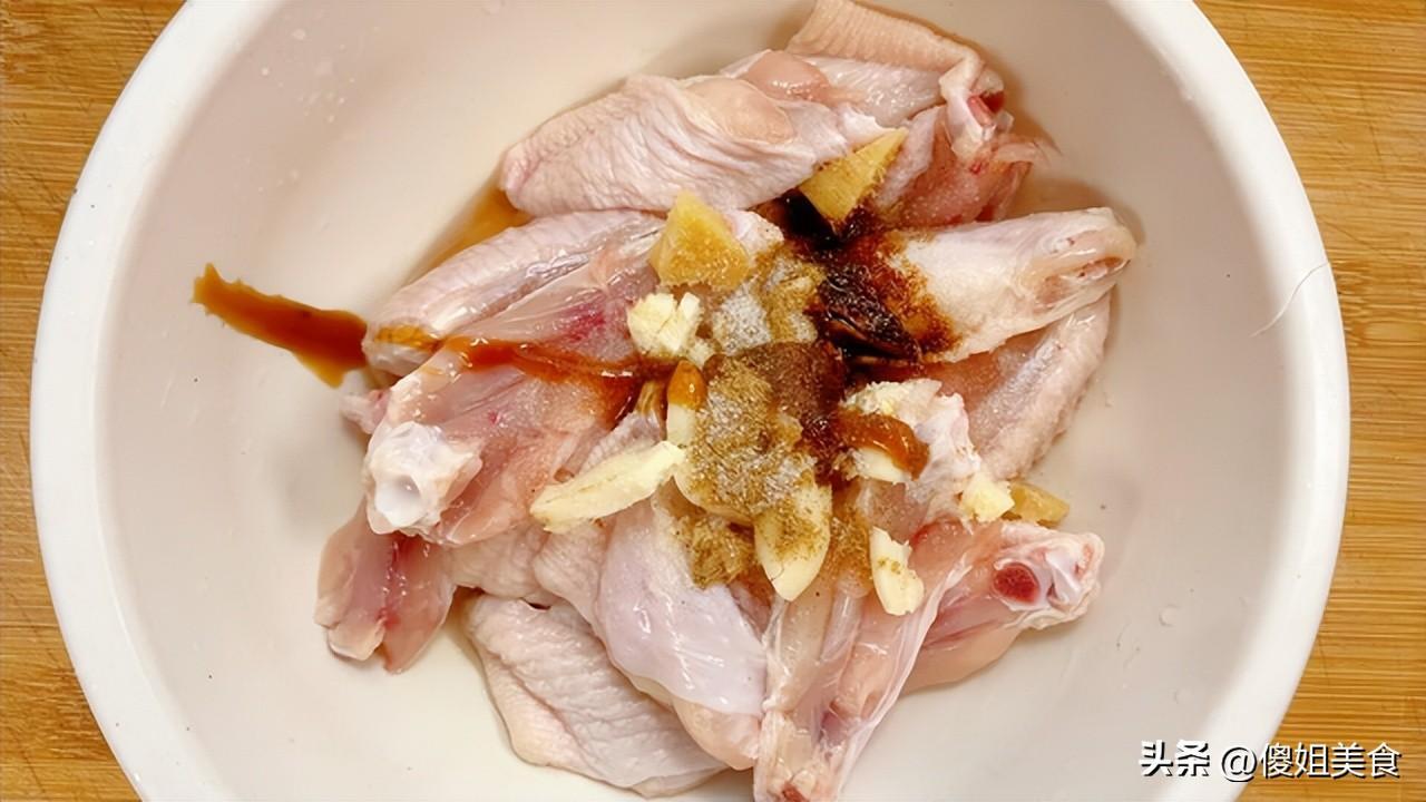 - 雞翅中洗淨,兩面劃幾刀以便入味,加入蒜末、薑末、生抽、老抽、料酒、蜂蜜、鹽和少量辣椒粉、花椒粉,抓勻醃製至少2小時。