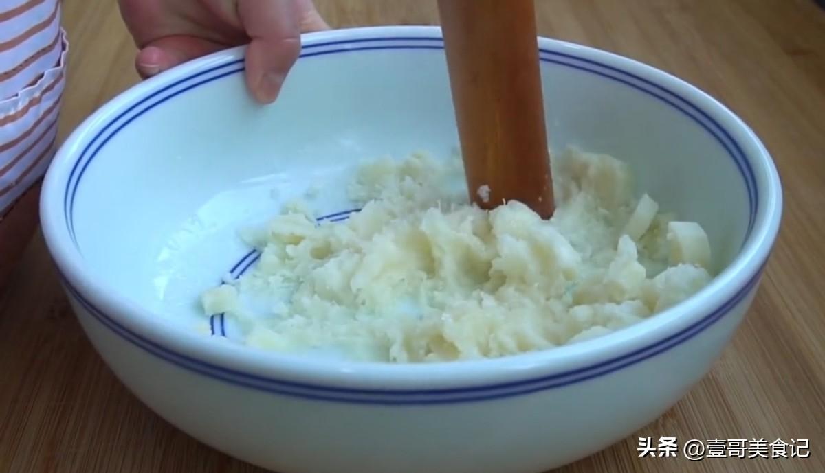 第三步,做山藥泥。剛從鍋中取出來的山藥還是比較燙的,我們可以讓它先晾一會,等到山藥不那麼燙了,給裏面加入一些白糖,找一個勺子或者擀麪杖,慢慢的將盤子裏的山藥塊全部壓成山藥泥,注意只要裏面沒有大的山藥小塊就可以了。