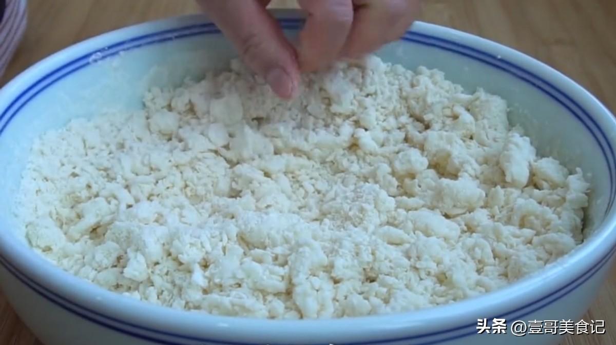 第五步,揉麪團。現在我們到了揉麪的環節,先把鬆散的面絮揉在一起。如果揉麪團的時候,覺得比較硬,大家可以把麪糰放在盆子裏醒一會兒,然後再接着揉麪,這樣就會比較容易了。