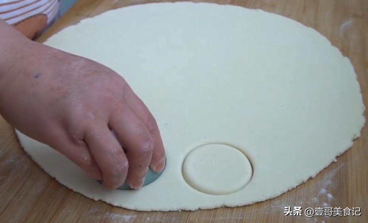 第七步,壓小餅坯。準備一個大小適中的杯子,只要是杯口的大小剛好和你的掌心差不多就可以了,用杯口來當模具,從大面皮上按下一個一個的小餅坯子,把餅坯掏出來放在一邊,把剩下的麪皮揉好之後,再擀成麪皮,重複以上操作,直到把所有的面都做成餅坯。