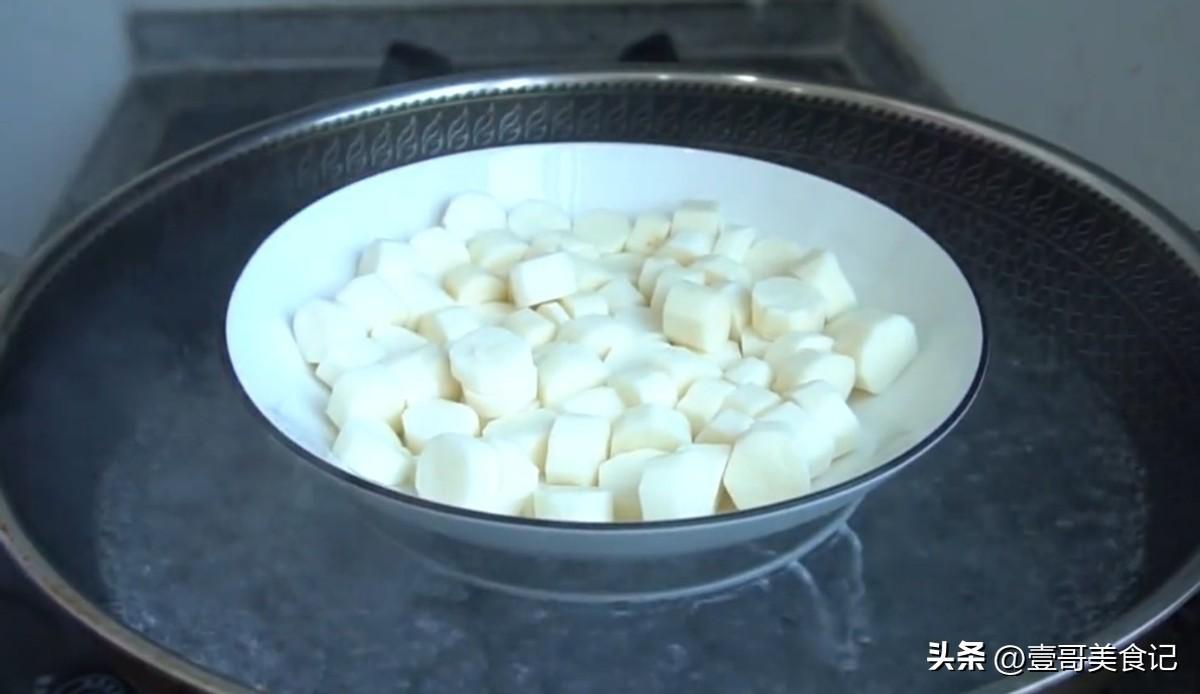 第二步,蒸山藥。給鍋中加入足量的清水,開大火進行加熱,等水燒開了,我們將裝山藥塊放的盤子放在籠屜中,蓋上蓋子蒸制大約20分鐘。等時間到了,我們掀開蓋子,用筷子搗一下山藥,發現它非常的綿軟,一下就戳進去了,就說明山藥已經全部蒸熟了,我們就可以關火了。