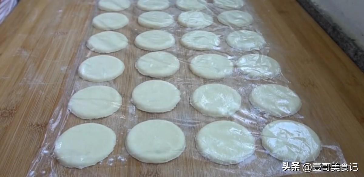 第八步,醒發。把做好的小餅坯整齊的排列在案板上,注意擺放它們的時候不要挨在一起。然後,給上面蓋上一張保鮮膜,讓小餅坯在保鮮膜下面靜靜的醒發一個小時。等時間到了,我們揭開保鮮膜,取出一個小餅坯,用手掂一掂,可以感覺到小餅皮的重量十分的輕,這是因爲它內部因爲醒發形成了許多小孔洞,會讓餅坯整個鬆軟起來,這個時候餅坯就醒發好了。