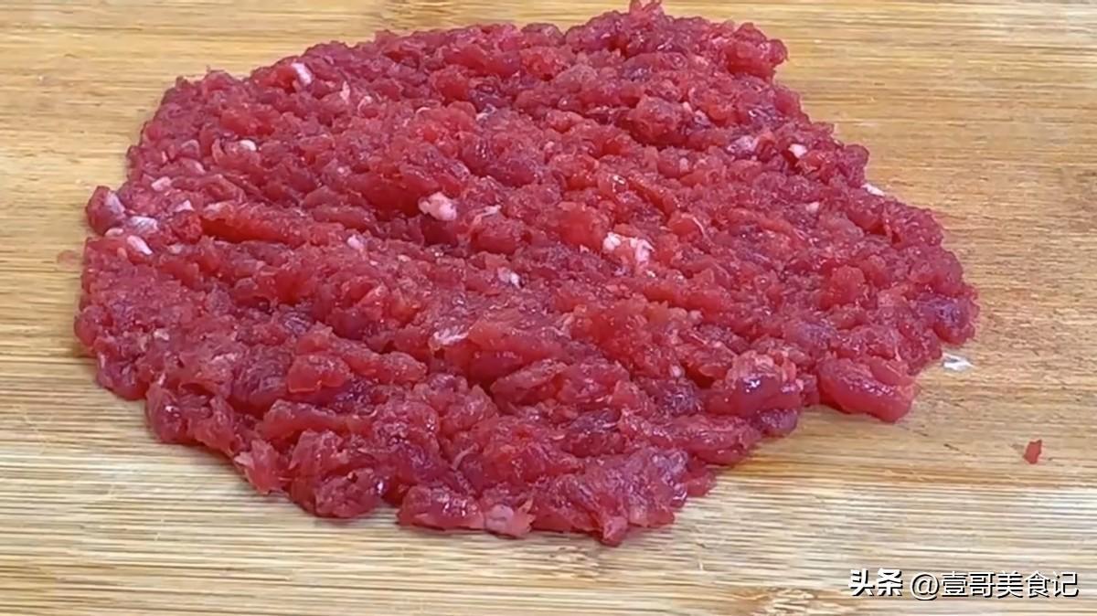 第七步,準備牛肉。選取一塊鮮嫩的牛肉,把它清洗乾淨一下,用廚房紙巾擦乾淨水。然後把牛肉放在案板上,先用刀把它切成片,然後再把牛肉片切成牛肉條,最後把牛肉切成小塊的,到這裏還沒有結束,我們需要將牛肉稍微切的碎一點,這樣喫起來口感好。切好後的牛肉放在盤子裏待用。