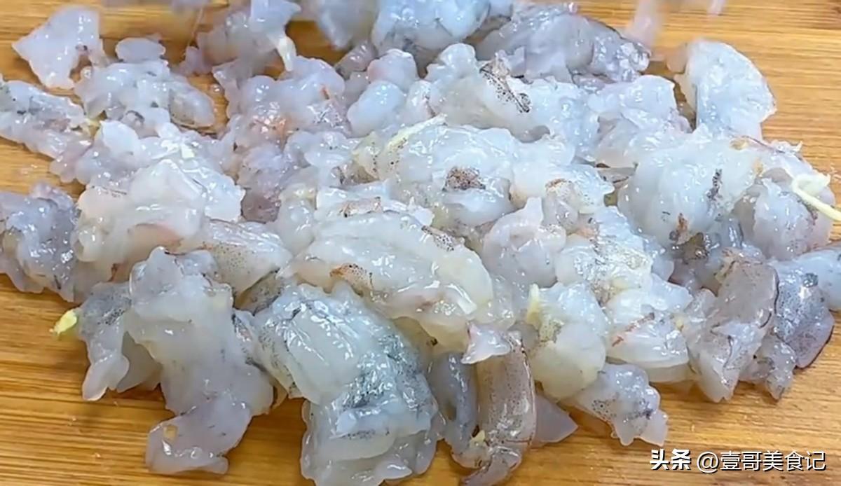 第九步,切蝦肉。蝦這時候也醃的差不多了,我們把蝦肉從盆子裏撈出來,盆子裏剩下的料就不要了。把蝦肉放在案板上,先用刀切成小塊,然後最後再切的碎一點,切好後放在盤子裏待用。