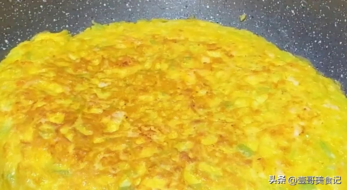 第十二步,煎制冬瓜蝦仁餅。起鍋燒油,等油熱之後,將冬瓜蝦仁雞蛋液倒進熱油中進行煎制。注意了,在它還沒有完全定型的時候,不要用鏟子翻動它,只要用鏟子把它表面整理平整就可以了。等餅子的底部煎至定型了,給雞蛋餅上面扣一個大盤子,把雞蛋餅翻過來倒進鍋裏,繼續煎制,要把雞蛋餅兩面都煎成金黃色,就把它倒到盤子裏面待用。