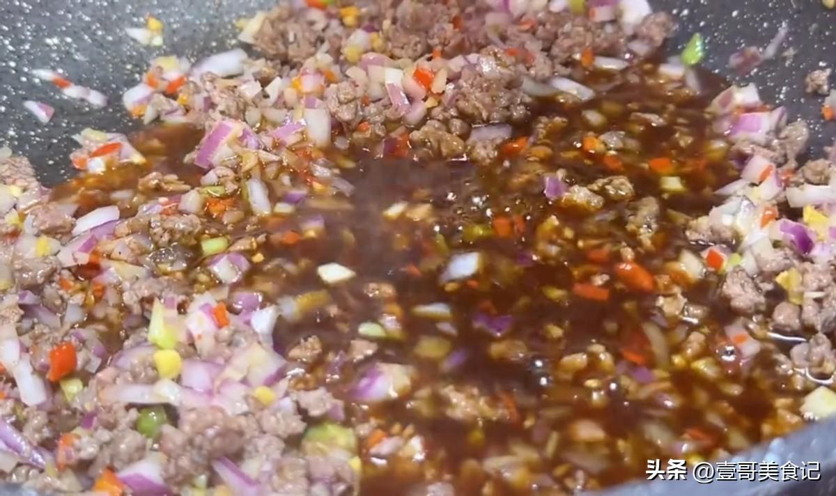 第十三步,燒料汁。繼續給鍋里加一勺食用油,等鍋裏的油熱了,先把牛肉末倒進鍋裏面,用鏟子將它翻炒至變色。然後倒入蔥薑蒜和小米椒一起進行翻炒,要把鍋裏的食材炒出香味。等炒香之後,我們把洋蔥丁也倒進鍋裏面,翻炒至斷生後倒入料汁攪勻。