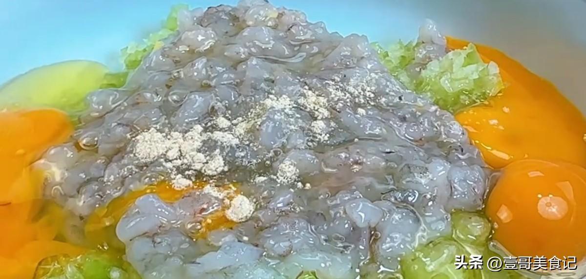 第十步,準備餡料。現在把裝着冬瓜碎的盆子拿過來,把切好的蝦肉倒進冬瓜裏面,然後再給裏面打進去三個雞蛋,接着加入一點胡椒粉,我們就可以用筷子進行攪拌了,我們要把這三種食材均勻的攪拌開來,就可以放着待用了。