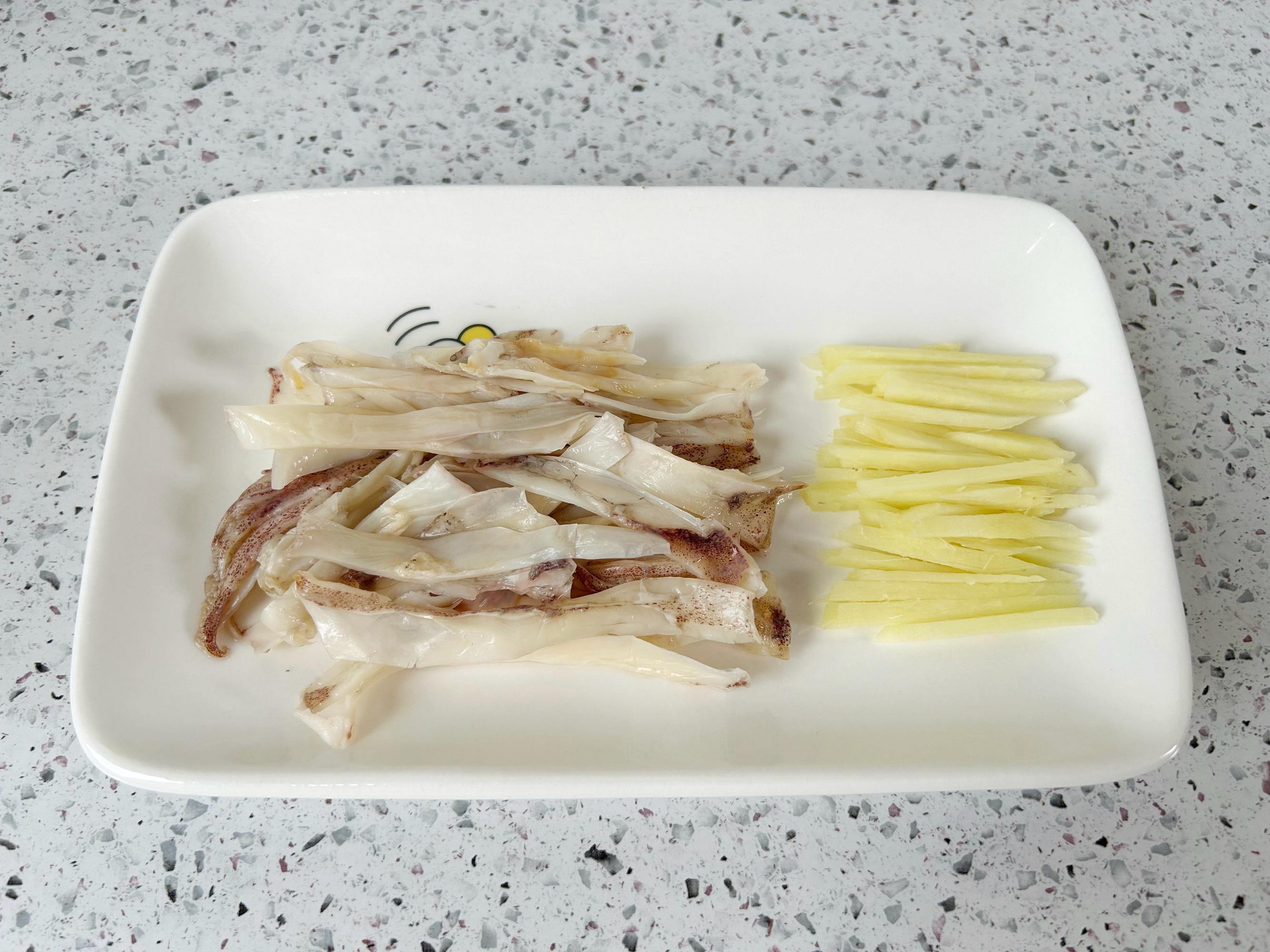 小魷魚乾用水泡發,清洗乾淨,切成細長條,生薑去皮切絲備用。