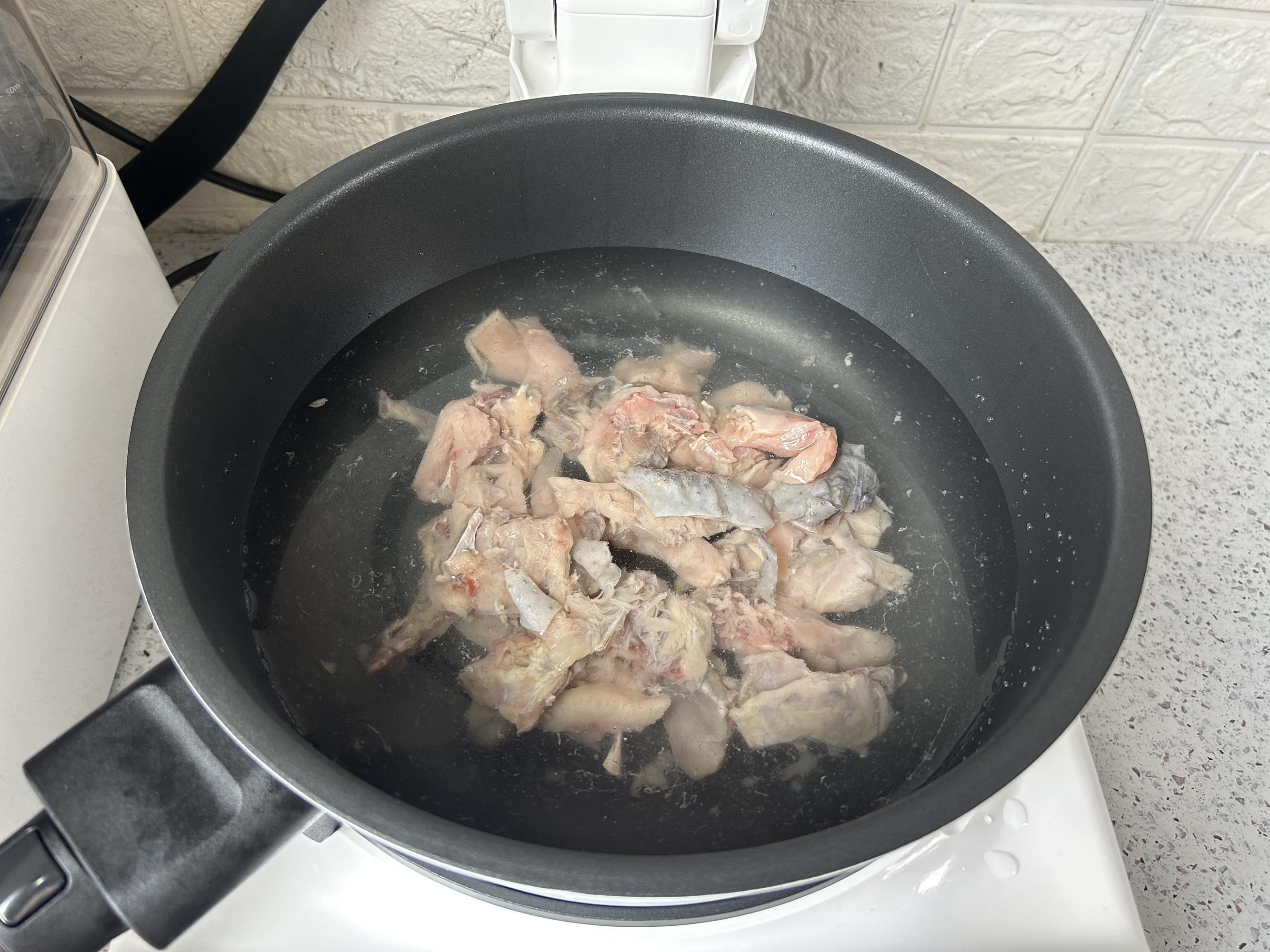烏雞肉冷水進鍋,中火加熱,開蓋煮開後再煮3分鐘,撈出來清洗乾淨浮沫,瀝乾水分。
