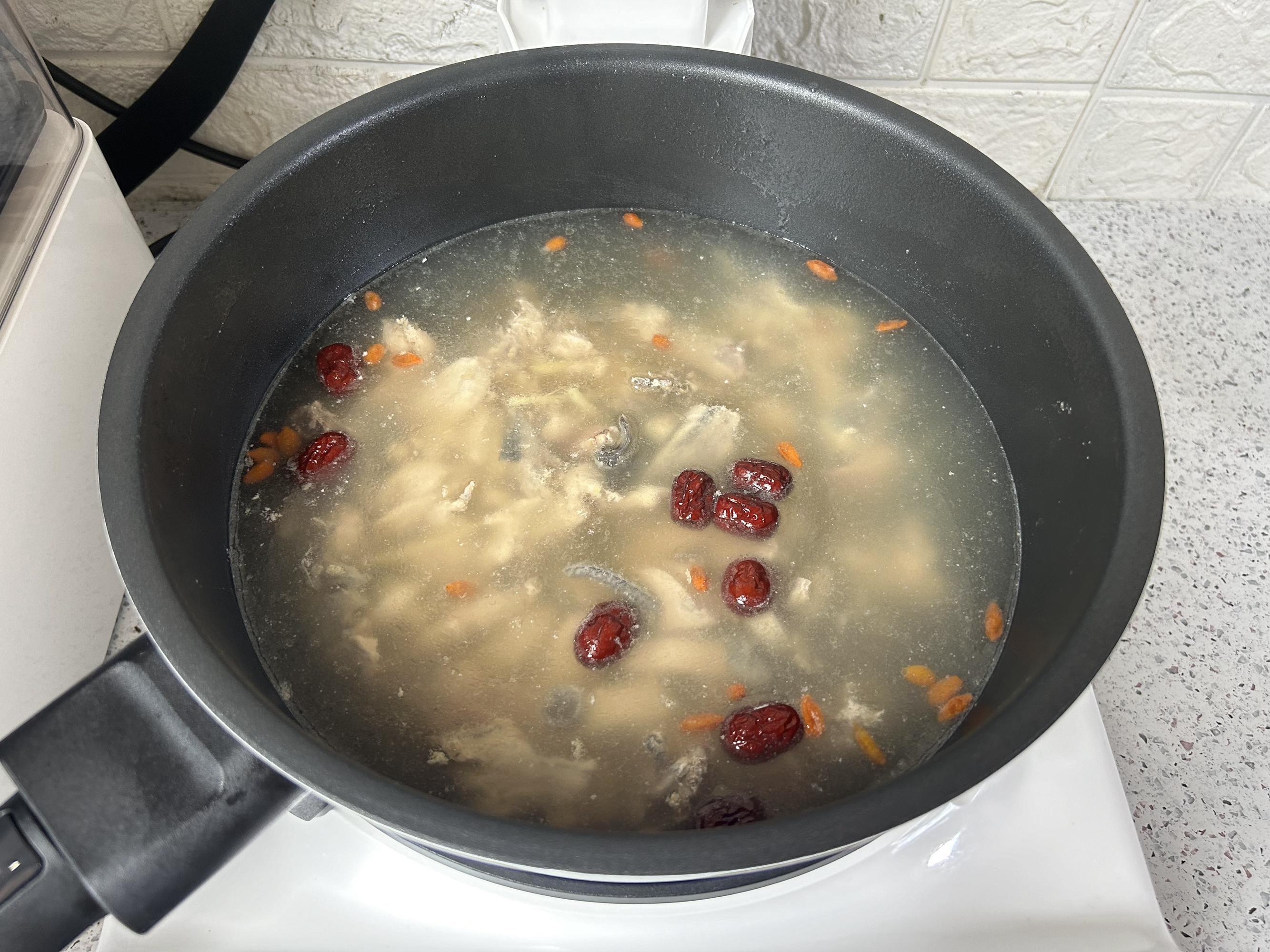 加入紅棗和枸杞,再煮10分鐘左右,加適量的鹽調味,一道營養好喝的魷魚烏雞湯就做好了。
